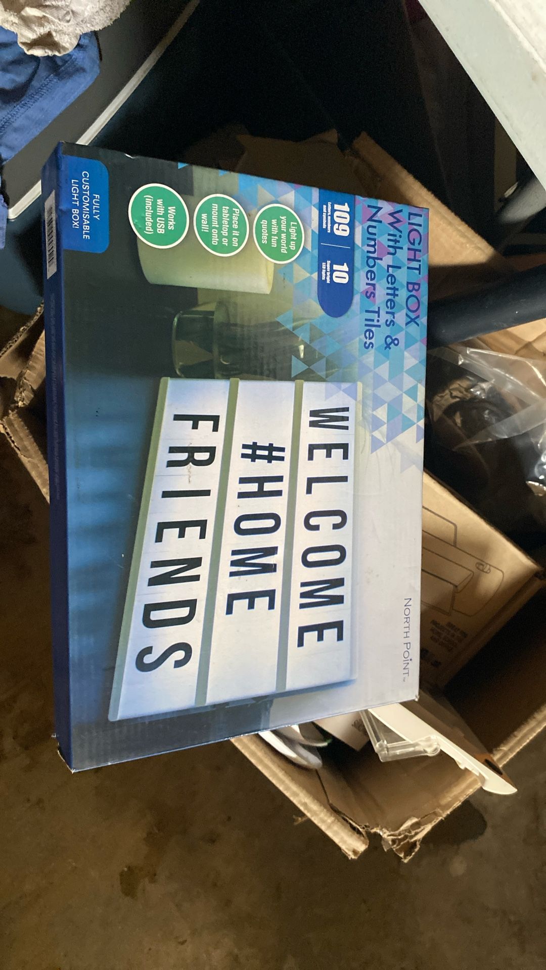 I have a light box with letters and number tiles. They light up your world with fun quotes. I’ve never used it. It’s open inbox has everything inside asking 15.
