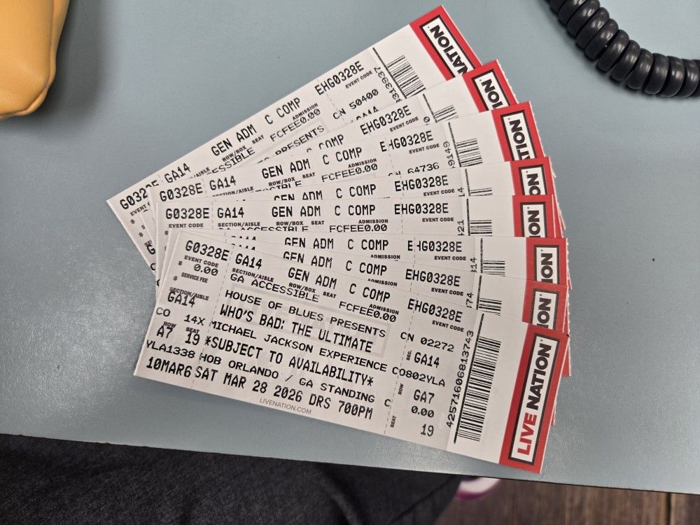 8 tickets to see Who's Bad: The Ultimate Michael Jackson Experience. Row A7 seats 12-19. I'm happy to split them up. I'm asking $20 a piece