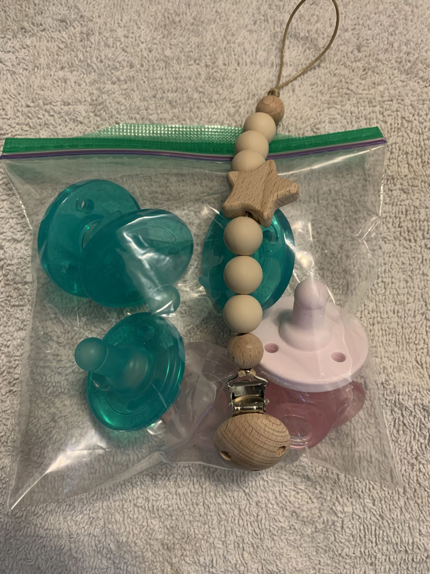 7 new pacifiers, but taken out of package. Baby disliked this style & we have many extras. Pacifier clip is free Porch pickup near Costco in Lynnwood. Cash dropoff or Venmo Message me with questions π