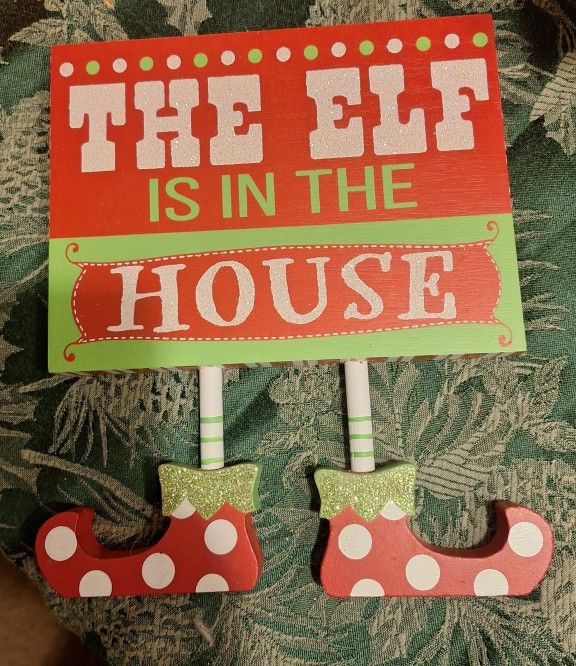 Cute and colorful standing wooden sign that states "The Elf is in the House". The Christmas decorative sign is approximately 9 1/2" tall & 7 3/4" wide. Item is in very good condition. Willing to meet in Modesto.