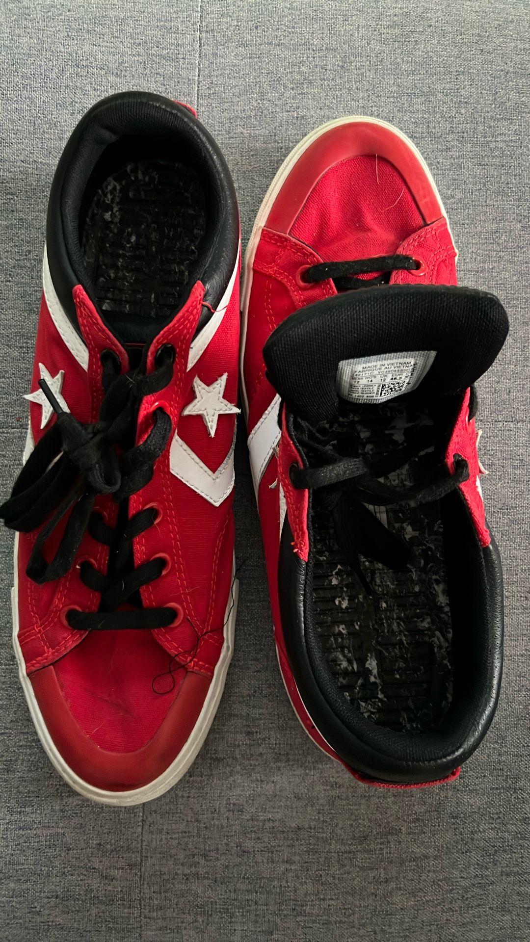 Converse indoor soccer shoes in red and white. Men’s size 12 (UK 12 / EUR 46). Used but still in good condition. Normal signs of wear on the insole, no major damage. Lightweight, comfortable, and great for indoor soccer, futsal, or casual wear.