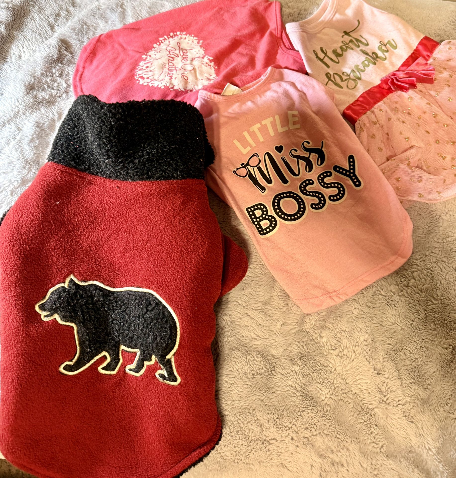 Dress your pup in style with this adorable small-dog clothing lot featuring a thick red-and-black fleece jacket with bear patch, plus three soft pink and red tees including “Love One Another,” “Little Miss Bossy,” and a “Heart Breaker” tutu dress. The fleece coat is perfect for cold-weather walks, while the stretchy shirts and dress are great for holidays, photos, or everyday cuteness; all are in good preowned condition with normal light wear.