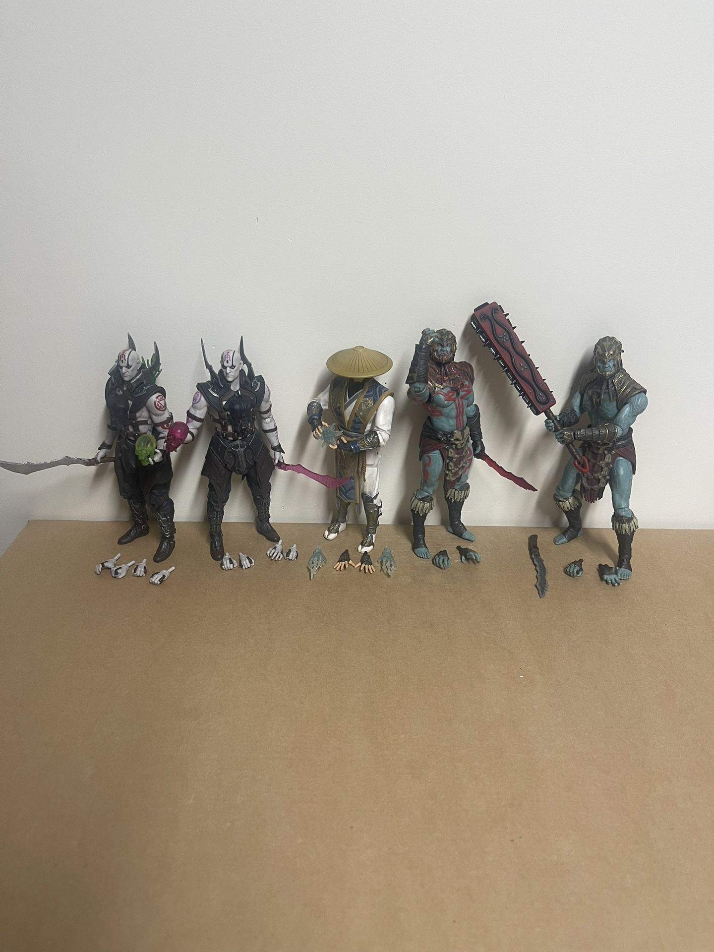 Comes with everything you see here Both versions of quan chi Both versions of kotal kahn And raiden