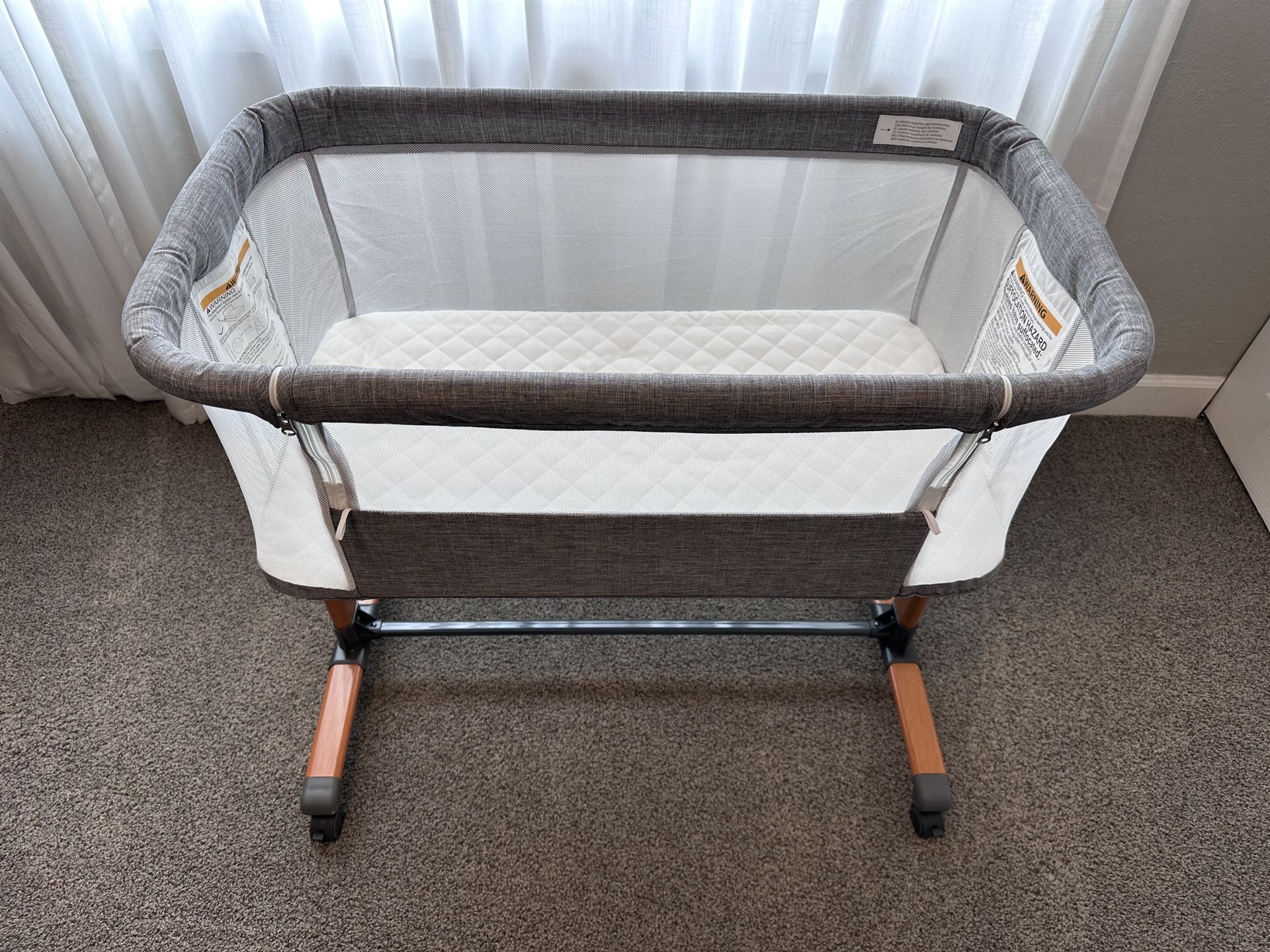 It’s only been put together, never used. We bought it and didn’t measure it first and it doesn’t fit where we need to put it. One side does unzip so it can be a bedside bassinet