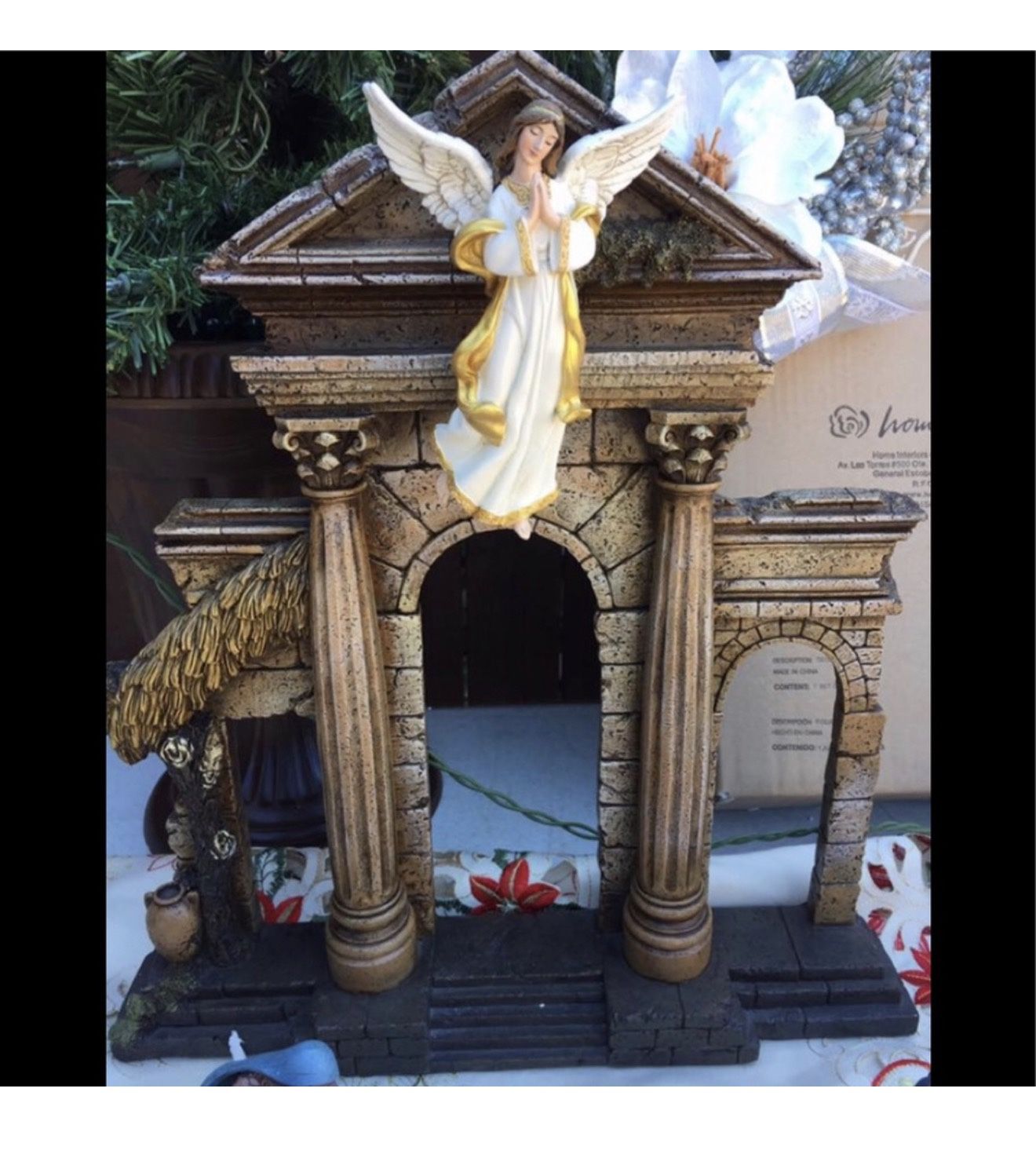 Resin Nativity Backdrop Home interiors and gifts- celebrating home collector's Series Crafted with intricate detail Made with high-quality materials, this nativity set is durable craftsmen. The setting is designed to host scenes from the nativity of jesus, Suitable for figurines between 9 and 11 cm tall. Dimensions: 16 × 3 × 17.5 inches tall approximately It Joseph figurine is not included Portal placa para su nacimiento . Es plano de atrás, puede colocar figuras de 9 pulgadas, . La Figura no se incluye solo para idea. El portal es nuevo. en caja original Dimensions: 16 x 3 x 17 3/4” Included:Angel figurine and the house plaque New in original box bundle not available in this piece, it is around 10 pound I need update the label, price are included