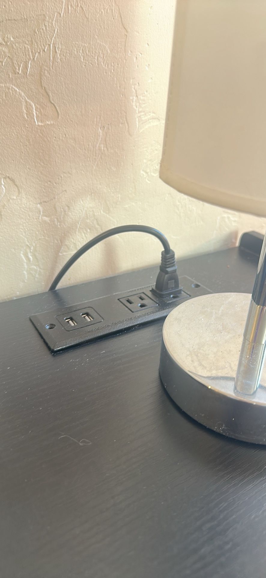 Selling a black nightstand with lamp due to moving out. Both are in good condition and fully functional. Items included: • Black nightstand with storage • Table lamp included • Built-in power outlet & USB ports (see photo) ✔ Clean and sturdy ✔ Smoke-free home ✔ Perfect for bedroom or guest room