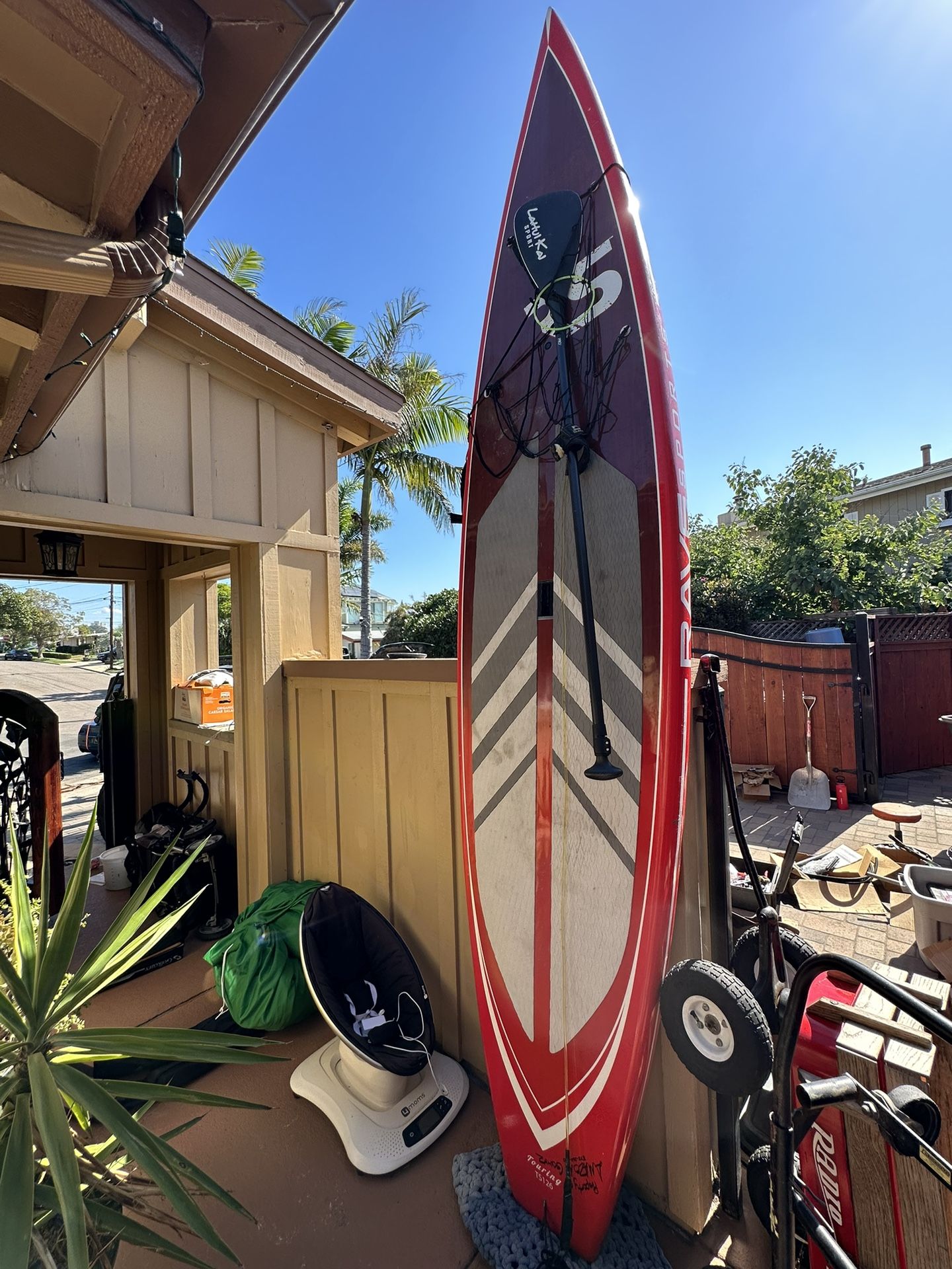 Original price was $1,299 No fin, original was a 10” fin, replacements run $8-20 online Minor cosmetic scratches, forgot to shake of sand before taking pictures. 12’6” x 30.5” x 5.5” (381cm x 77cm x 14cm) Board weight: 36 lbs. Rider weight: 240 lbs. EPS foam core with wooden stringer Fiberglass layers with extra side rail reinforcement Crowned top deck with EVA deck pad 5 leash plugs Elastic cargo net Self venting plug Ergonomic recessed handle