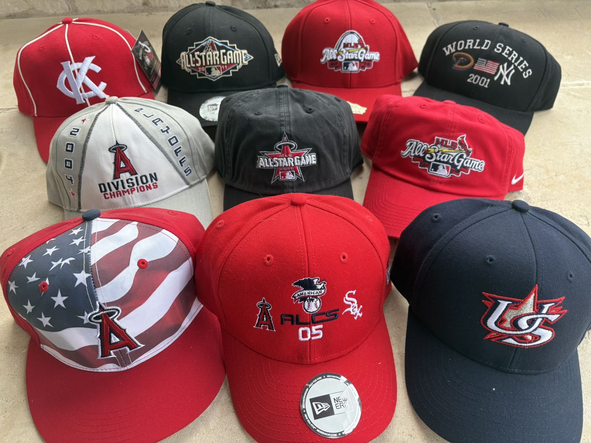 Vintage Hats for Sale $20.00 each US World Baseball Classic Hat Angels/White Sox 2005 ALCS Hat Angels Flag hat Angels 2004 Division hat Kansas City Monarchs hat Angels 2010 All Star Game hat Cardinals 2009 All Star Game hat D-Backs/Yankees 2001 World Series hat Cardinals 2009 All Star Game size m/l hat D-Backs 2011 All Star Game hat Available for porch pickup Shipping is also available