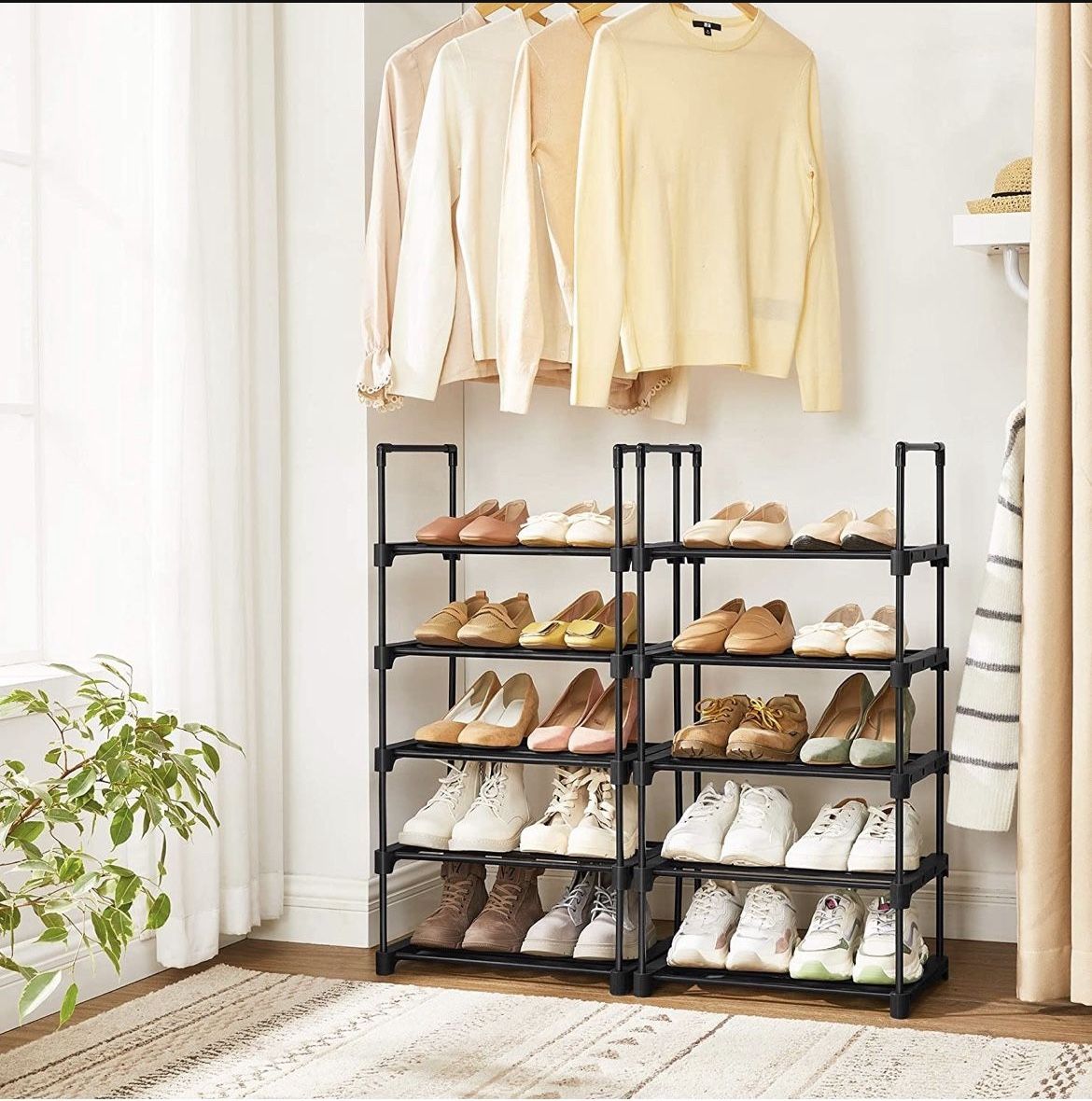 Set of 2 —————- SONGMICS 5-Tier Shoe Rack, Metal Shoe Storage Organiser, Stackable Storage Rack, Space-Saving, Freestanding Shelf, for Hallway, Bedroom, Living Room, Black Room type Bedroom, Living Room, Hallway Number of shelves 5 Product dimensions 89.5D x 45W x 45H centimetres Brand SONGMICS Assembly required Yes Recommended uses for product Shoes