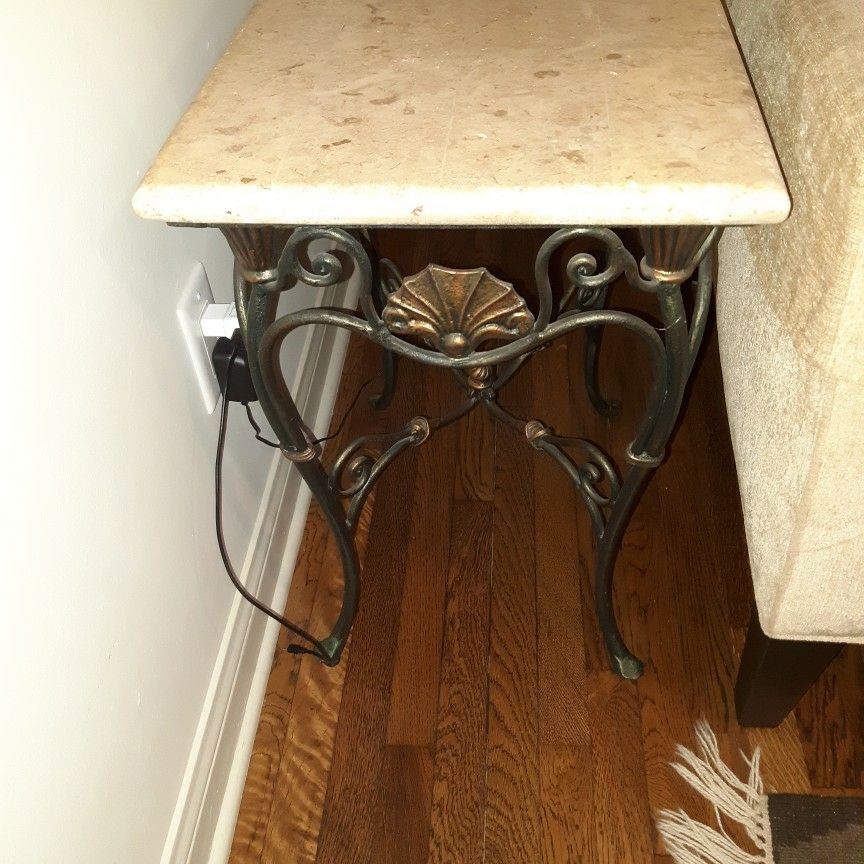 travertine or marble not sure of the Natural Stone occasional table with metal legs. It measures 16 by 19 1/2 and 23 in tall