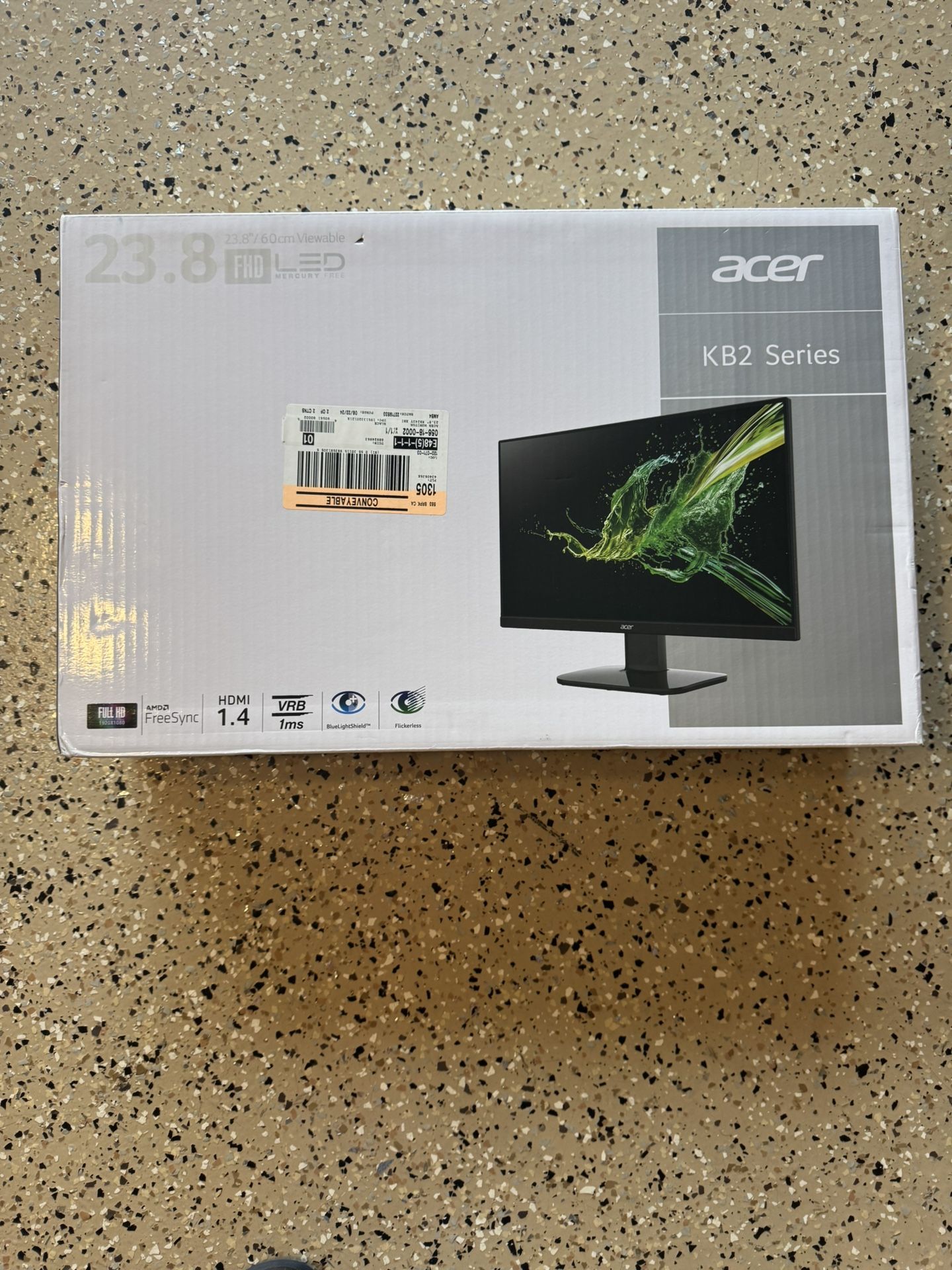 Brand new never opened. Acer KB242Y E 24" Full HD IPS Monitor – 1920x1080, 1ms VRB, 100Hz, AMD FreeSync, HDMI & VGA, Built-in Speakers, VESA Mount, Flicker-Free, Ultra-Thin Bezel • Full HD 1080p resolution (1920 × 1080) — delivers crisp, true-to-life visuals. • AMD FreeSync™ Technology — synchronizes GPU and monitor refresh rates for tear-free gameplay. • 100Hz refresh rate — smoother motion and reduced input lag for fast-paced gaming. • Acer EyeProtect™ suite — Flicker-less, Blue Light Filter, ComfyView, and Low Dimming reduce eye fatigue. • ZeroFrame™ design — ultra-thin bezels for a clean aesthetic and ideal multi-monitor setup. • 1ms VRB response time — eliminates ghosting for sharp, clear frames during motion-heavy scenes. • Adjustable tilt stand — allows comfortable viewing angle adjustments. • VESA mount compatible (100×100mm) — easy to mount on walls or monitor arms. • Dual input options — HDMI and VGA for flexible connectivity.