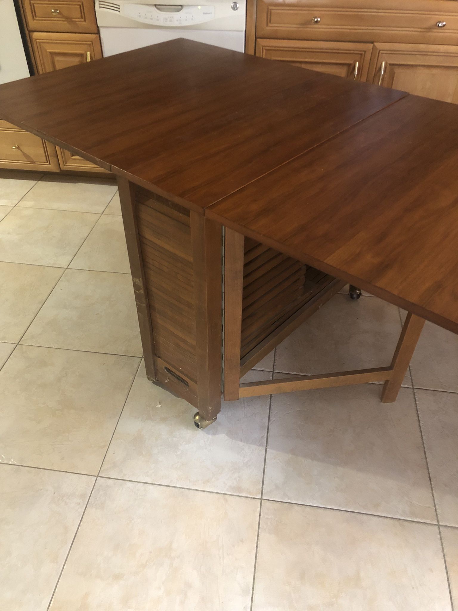 When table is closed it is 34 x 12 x 29 high. The side opens and exposes for solid wood chairs. The opposite side opens for a utensil drawer. When the table is opened, it opens to 62 x 34 x 29 high it seats 4 to 6 people comfortably. When not in use, it is a great sofa table.