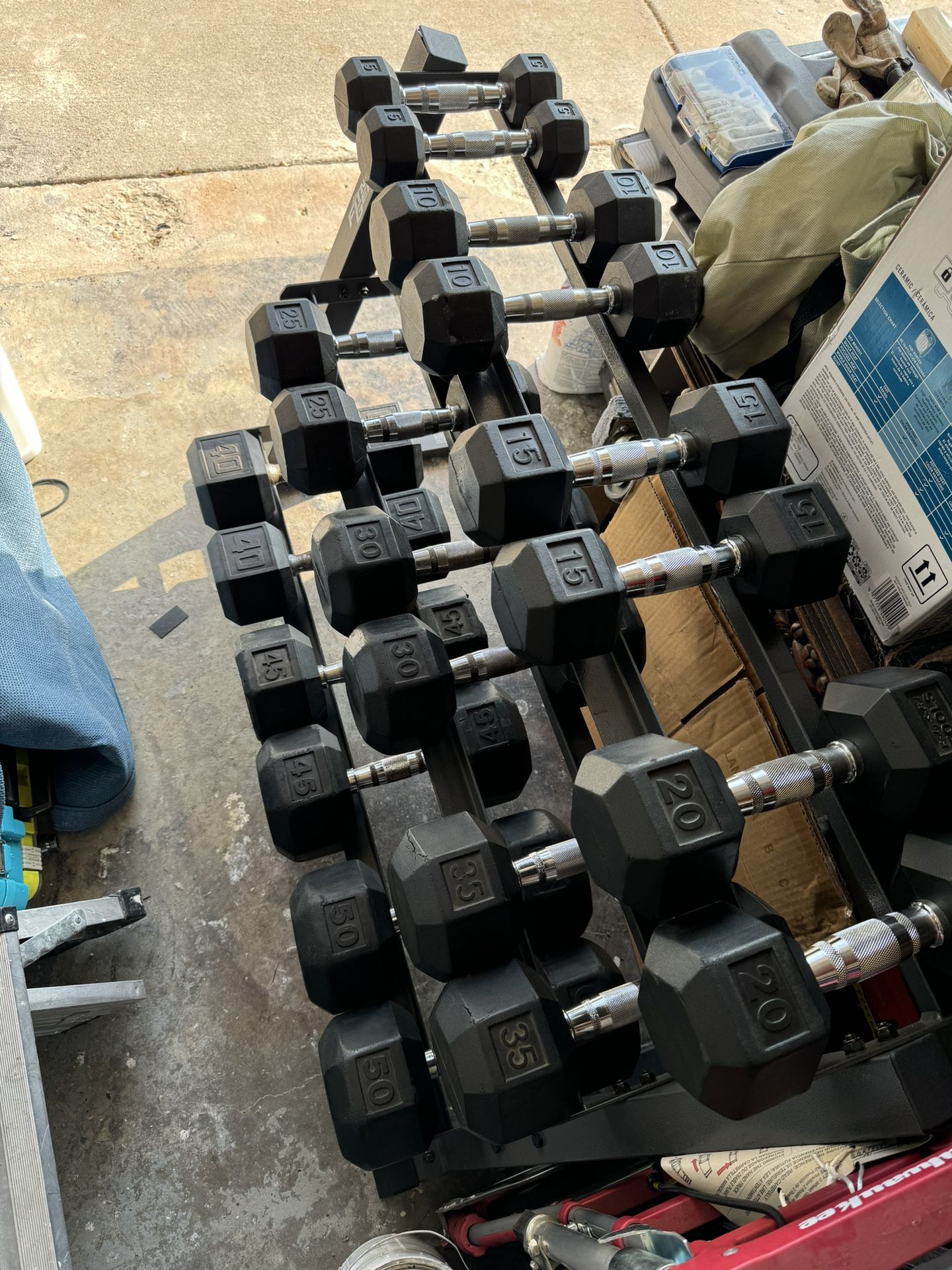 I have a set of rubber end Hex dumbbells 5-50 lbs and a 3 tier rack to hold them all $580 cash firm (Only 1 of the 45lb dumbbells has rubber missing on the ends of it but it’s still very functional) 550 lbs total in weights. 2)50 lbs 2)45 lbs 2)40 lbs 2)35 lbs 2)30 lbs 2)25 lbs 2)20 lbs 2)15 lbs 2)10 lbs 2)5 lbs
