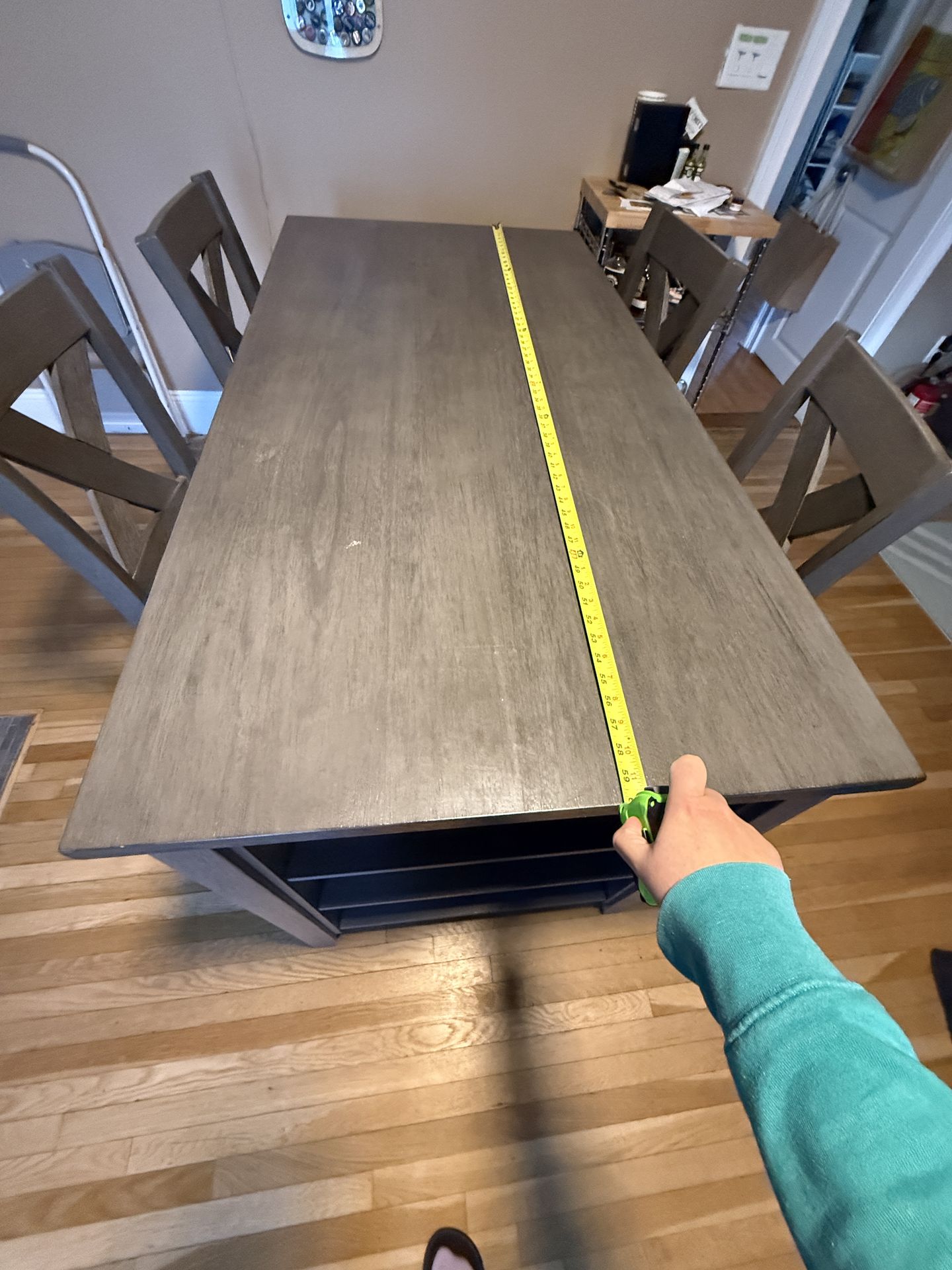 Bar height table with shelving at one end and four bar height chairs for sale. Purchased from wayfair. Some discoloration on table surface from acetone, please refer to picture of table surface for more detail.