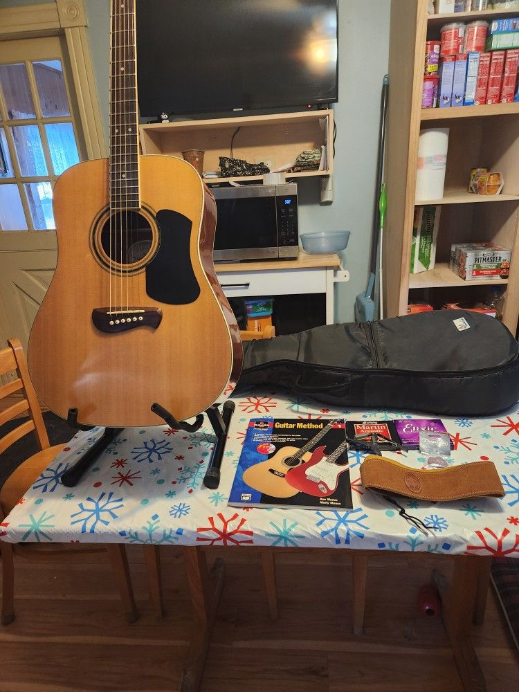 Beautiful Guitar Model#OD-5 SI10704146. Comes with teaching book,capo,picks,2 sets of replacements strings,planet waves suede strap,soft case,stand. Pick up in Southbridge. Cash only