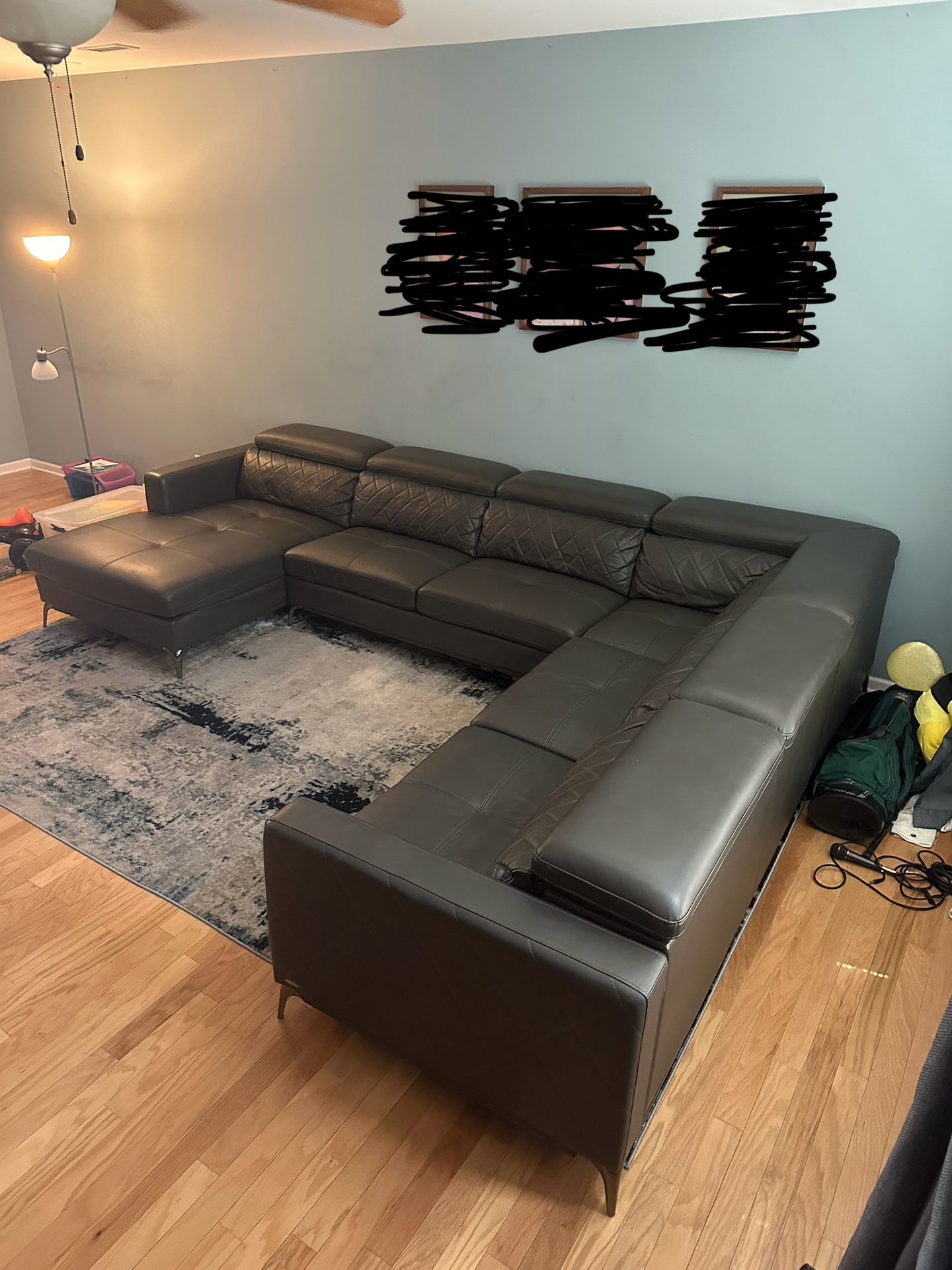 I’m selling this sectional in excellent condition from Sofia Vergara. Rooms to go online still shows the description and dimensions (some still available in the show rooms) so if you google the name of this sectional, you can see more photos and more details regarding this item. Their description is as follows: “Modern elegance with a contemporary twist, the Via Sorrento sectional offers indulgent comfort with a side of quality. Upholstered with black fabric, this sectional is far from ordinary thanks to special touches such as quilted back cushions, ratchet style headrests, contrasting stitching and sleek chrome finished legs. Seating up to six adults, this luxurious sectional takes center stage in any living space. Upholstery 85% Polyester, 15% Polyurethane.” DIMENSIONS: 153”w x 116”d x 31”h This sectional is easy to maintain and clean and the headrests pop up on all portions aside from the corner section (by design). Please text or email Zach at (contact info removed) if you are interested. Also, I can deliver this couch (included in price) if travel is reasonable.