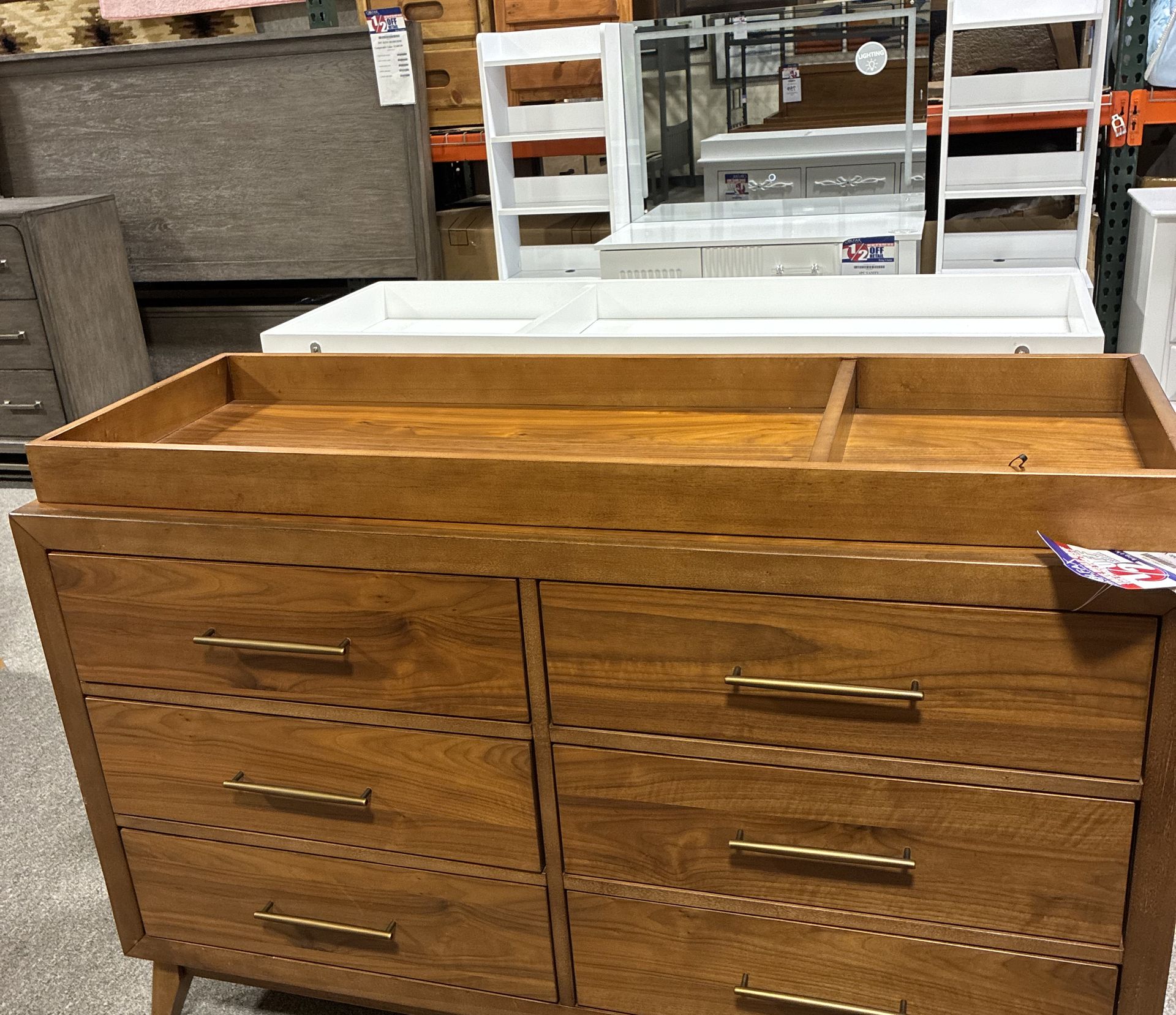 Beautiful NEW stylish wood dresser with a removable changing table topper. Has six spacious drawers with gold bar handles. Tapered legs. Great for nursery or bedroom storage. Great buy only asking purchase price. Can deliver within reasonable miles of Clemmons if purchased in the next few days. You would need own people to unload.