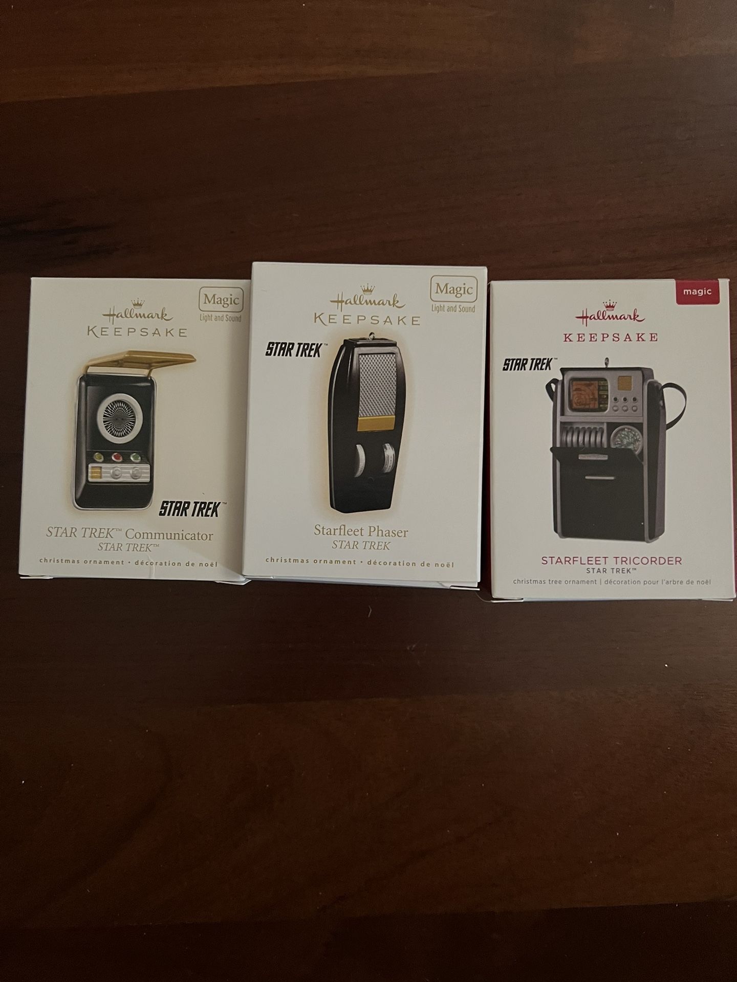 Hallmark ornaments Star Trek 2008 Star Trek Communicator ( light & sound) $25 2009 Starfleet Phaser (light & sound) $40 2018 Starfleet Tricorder ( light & sound) $40 All for $75