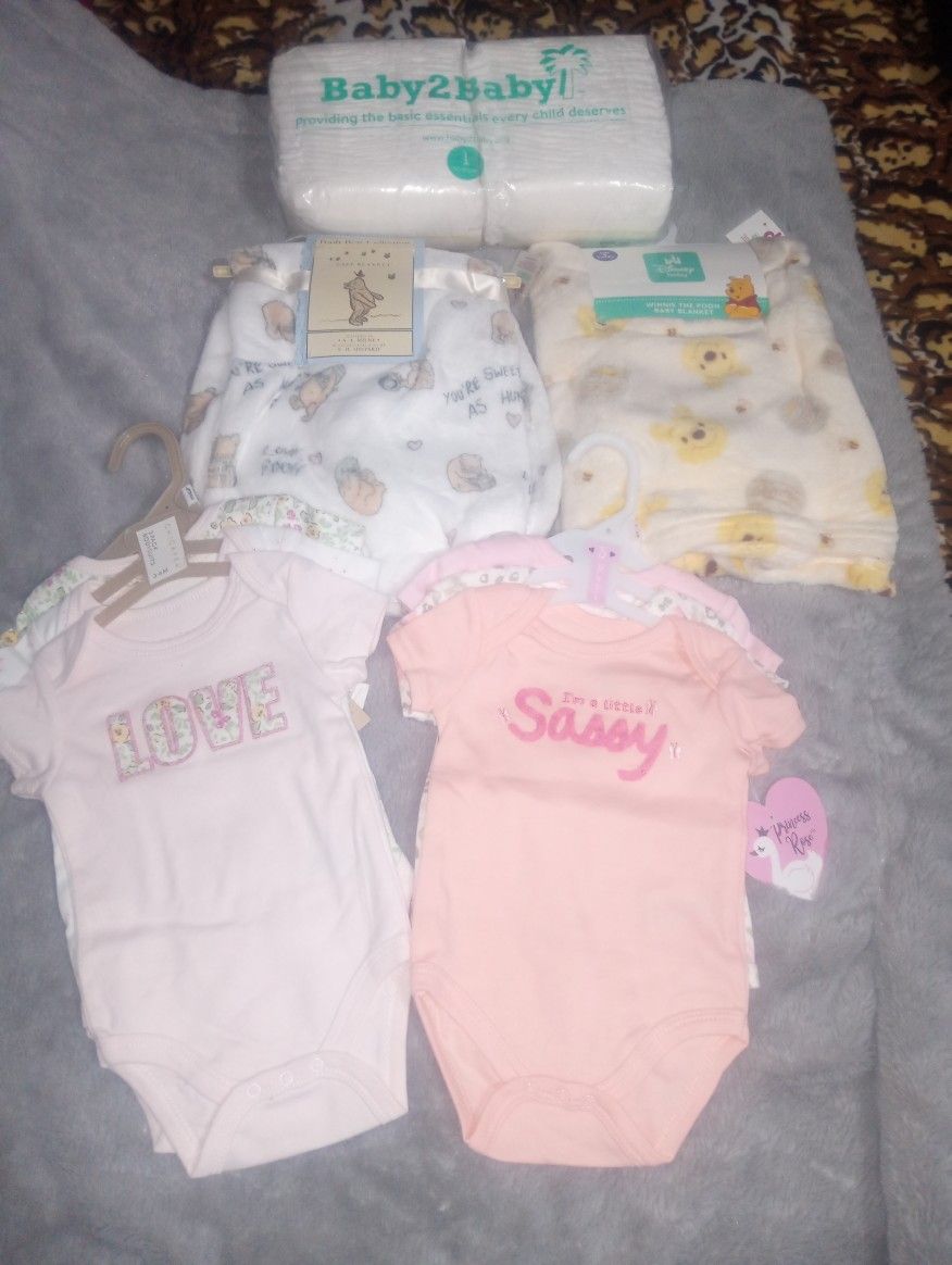1 pk size 1 diapers, 2 blankets, 6 onesies. All brand new.