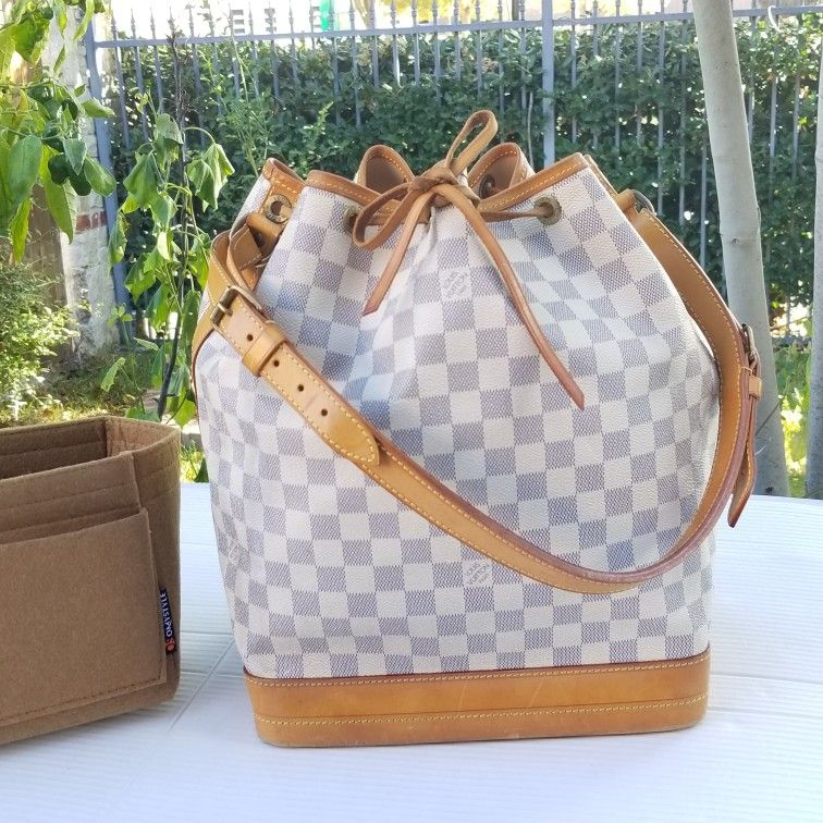 Authentic Louis Vuitton Noe Damier Azur large shoulder Crossbody bag classic Damier print, in a modern azur with light brown leather trim, this Noe bag is a modern classic. drawstring top fastening long flat shoulder strap for ease of carrying. Solid firm square base with soft circular top, the interior is wide, compact yet very spacious and will fit more than just your daily essentials Good pre-owned condition. Honey patina of the leather bits. Some scuffing noted on edges. Interior has some spots and stains. will come with purse organizer shown. Bag is used so please see all pictures and manage your expectations as it's not new, good condition with lots of life left. H: 13.78" x L: 11.03" x D: 7.5" shoulder strap 25" adjustable $ 950 FIRM Cash only. pick up in Arlington