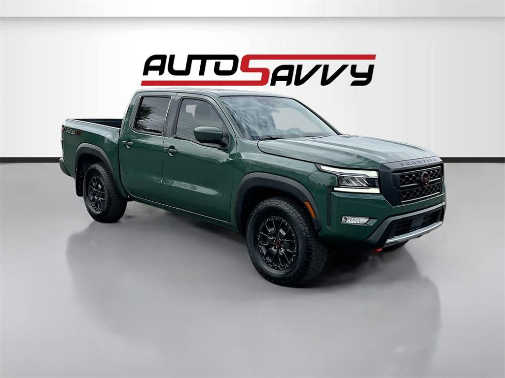 Explore the rugged elegance of the 2023 Nissan Frontier Crew Cab PRO-4X 4x4, available now at AutoSavvy Gilbert. This Tactical Green Metallic pickup is engineered for adventure, powered by a robust VQ 3.8L V-6 engine delivering 310 horsepower, paired with a 9-speed automatic transmission. With only 22,936 miles, this vehicle is practically new and ready for your next journey. The Frontier boasts a sophisticated interior with Charcoal leather seats accented by Lava Red stitching, heated front seats, and a heated steering wheel for ultimate comfort. Stay connected with advanced technology like Apple CarPlay, Android Auto, and a premium sound system. Safety is a priority with features such as Blind Spot Monitoring, Lane Departure Warning, and an Intelligent Around View Monitor. This 2023 Nissan Frontier comes with a branded title, reflecting AutoSavvy's commitment to providing exceptional value without compromising quality. As a Savvy Certified vehicle, it has undergone a meticulous inspection to ensure high standards of reliability and performance. Enjoy peace of mind with our 4-month/4,500 Mile Warranty, underscoring our dedication to quality and customer care. Visit AutoSavvy Gilbert today to experience this remarkable Frontier, where cutting-edge technology meets rugged performance for an unparalleled driving adventure.