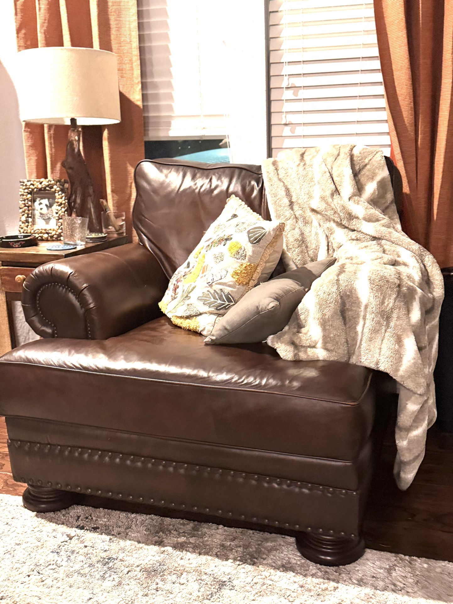 Over size Sofa Chair from Ashley Furniture in great condition. Very clean. Leather like dark brown and accent nail head trim thru out. 46 inches wide 43 inches deep. Great accent chair for any room Heavy sturdy Will Need help to pick up. $300.00 Need gone. Firm on price No rips or tears