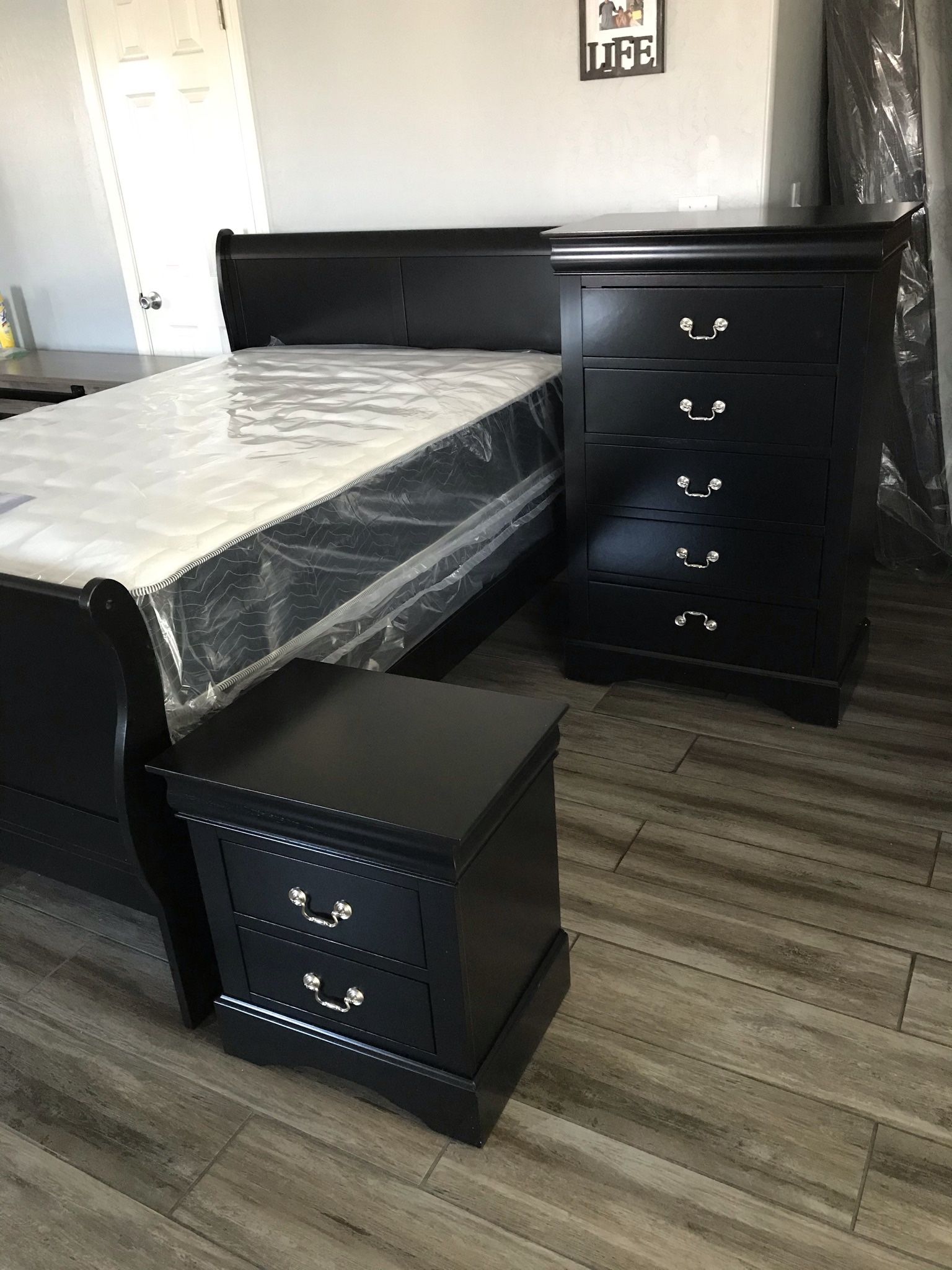 New queen size bedroom set Tall dresser Queen bed frame Mattress and box spring 1 nightstand Pickup in Lindsay Hablo Español Delivery and setup available