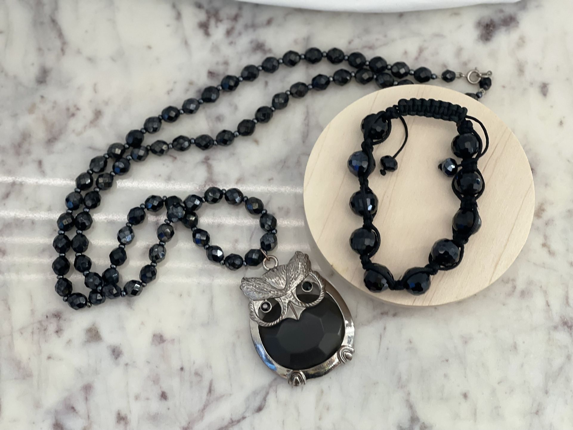 Costume jewelry-long owl charmed long necklace with matching bracelet