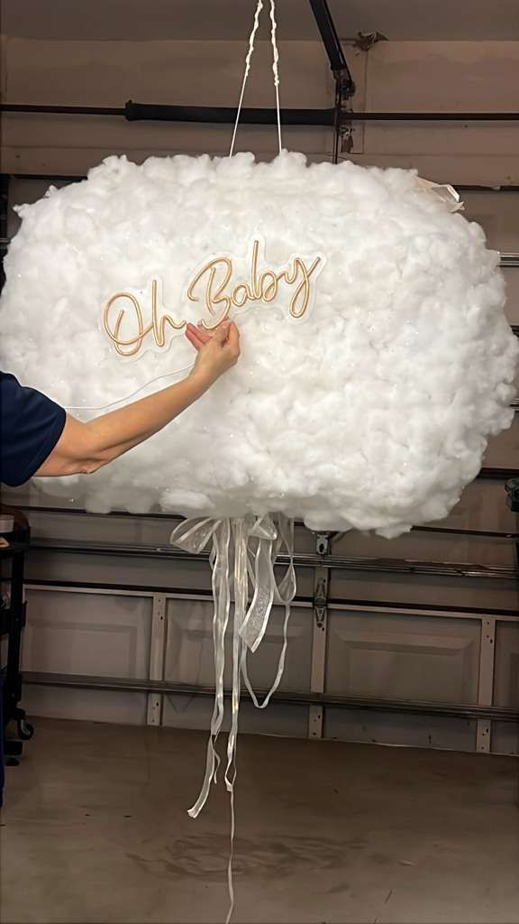 Nube para revelación de sexo, hecha a mano con luces y espacio para globos y confeti Cloud gender reveal