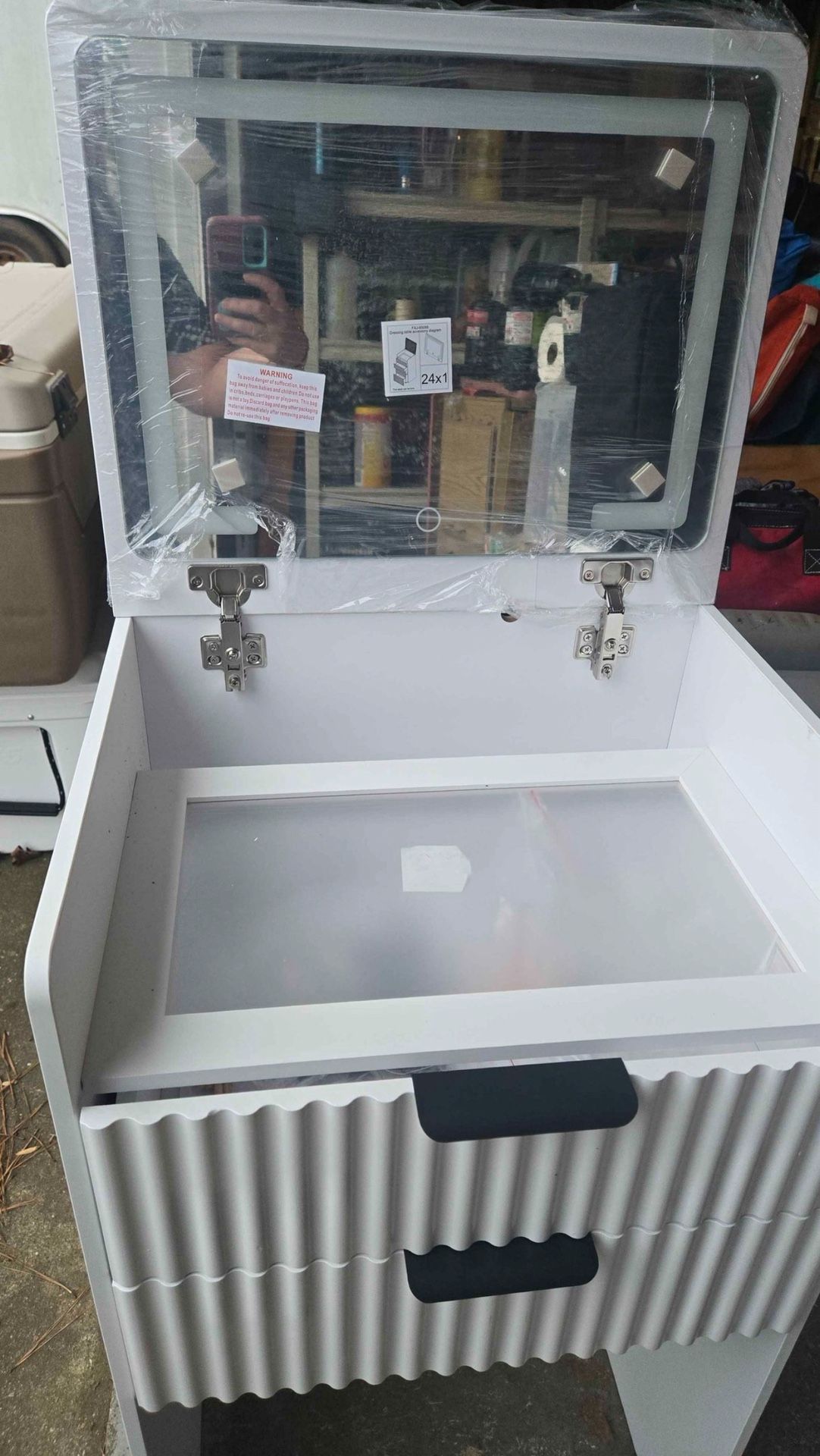 White Vanity with Flop Down Mirror.