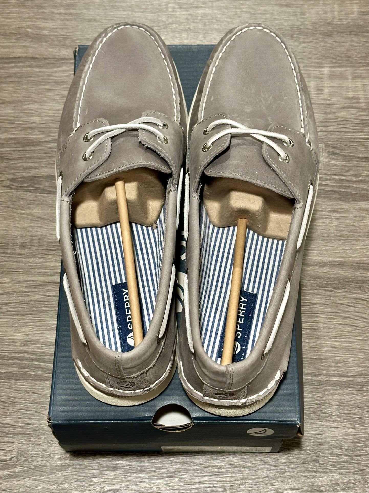 Selling a brand new, never worn pair of Sperry A/O 2-Eye Double Sole boat shoes in grey leather, size 13 - high-quality craftsmanship meets classic style. ✨ Why These Are Great: • Premium LITE nubuck leather upper for a refined, durable look. • Hand-sewn moccasin construction with rawhide laces for durability and classic design. • Enhanced PLUSHWAVE™ double sole — lightweight cushioning and long-lasting comfort. • Razor-Cut Wave-Siping™ outsole for superior wet/dry traction — ideal for boating or everyday wear. • Rust-proof eyelets made from recycled materials — practical and eco-conscious. 📦 Condition & Details: • Brand new, never used • Size: US 13 (very hard-to-find size!) • From a smoke-free, pet-free home • Local pickup available in Paramus, NJ (also open to meeting at a mutually convenient location in NJ or NYC) 💰 Price: open to reasonable offers from serious buyers ⚠️ Serious buyers only — Please don’t waste my time if you’re a scammer or not genuinely interested in carrying a conversation to figure out details on buying the item.