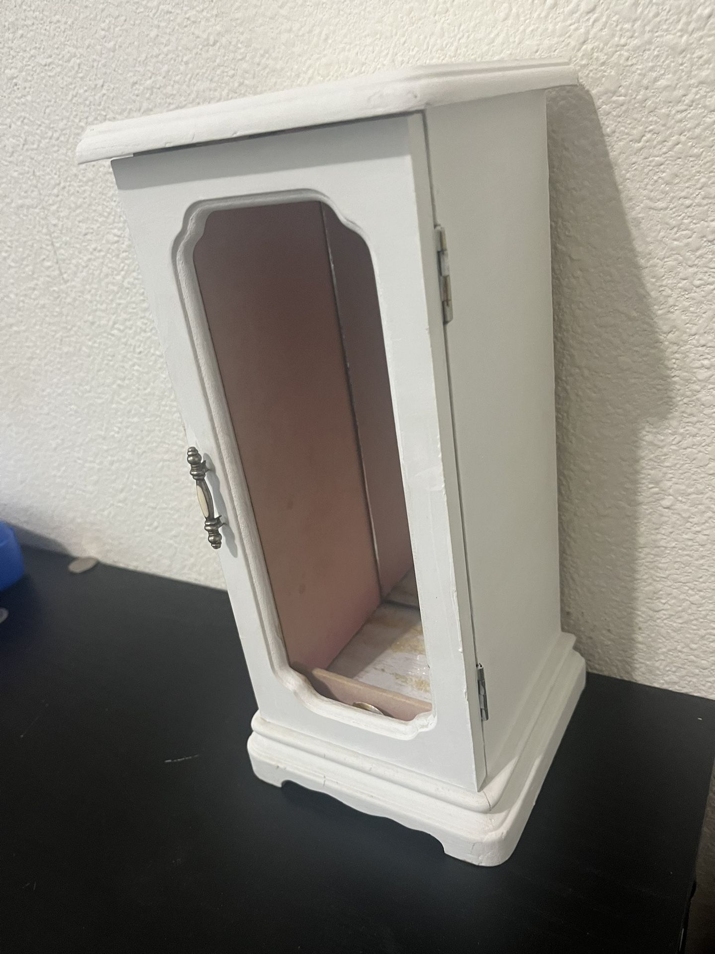 Vintage jewelry box with mirror white on outside inside pink. Closing door