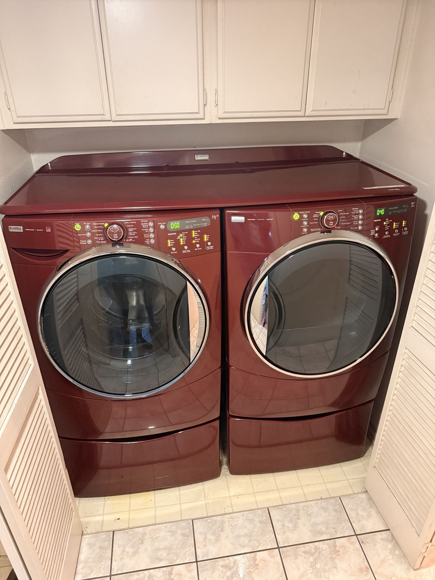 Top brand great condition washer and dryer: This set has been well maintained and cared for. Dryer has two steam setting to de-wrinkle clean clothes. Also has a rack that goes inside to dry shoes n hats and other stuff you wouldn't want to tumble dry. Comes with the pedestals and the top piece that covers both appliances; perfect for placing folded clothes on or just keeping detergents etc. on it. I paid $5200 for the set and both washer and dryer were serviced every year to keep them new. I'm asking $800 for the set. The pedestals have drawers that pull out for storage and usually sell alone for $300 a piece. Im moving in 2-weeks and I just don't want to have to move them. The color is like a Candy Apple Red. Hit me up!