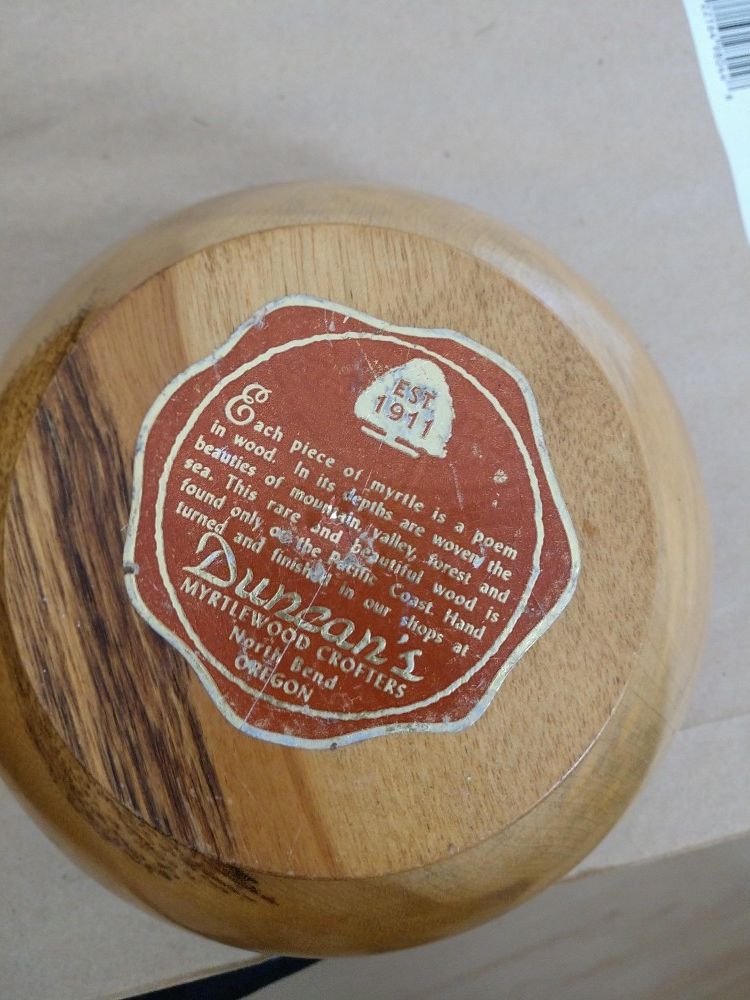 Duncan's Myrtlewood Bowl Bayview Manufacturing , North Bend, Oregon Excellent condition Measures 6 " in diameter x 3 " h This beautiful bowl is in excellent condition and very deep! This is rare and beautiful wood, and Only found on the Pacific Coast or Israel.