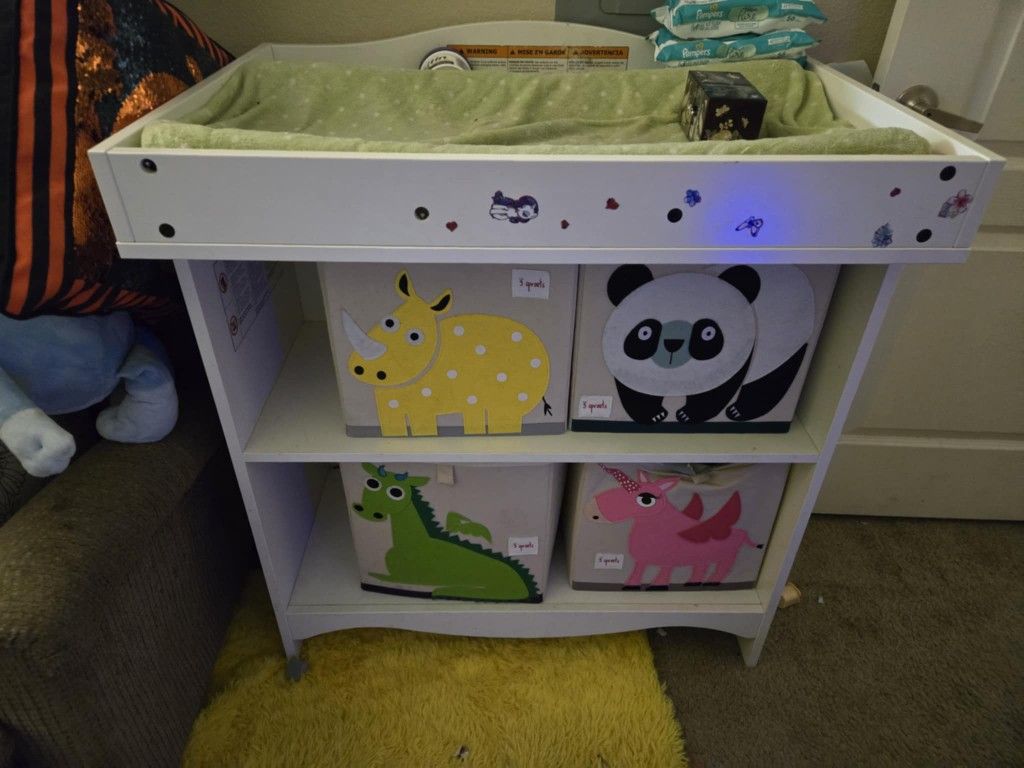 SMÅGÖRA Changing table/bookshelf, white Comes with changing pad, 7 pad covers with opening for buckles and 4 cloth character buckets space behind changing pad, for wipes, diapers, cream. Character buckets are larger size (close to a 1 ft cube in size each). As is, pickup only.