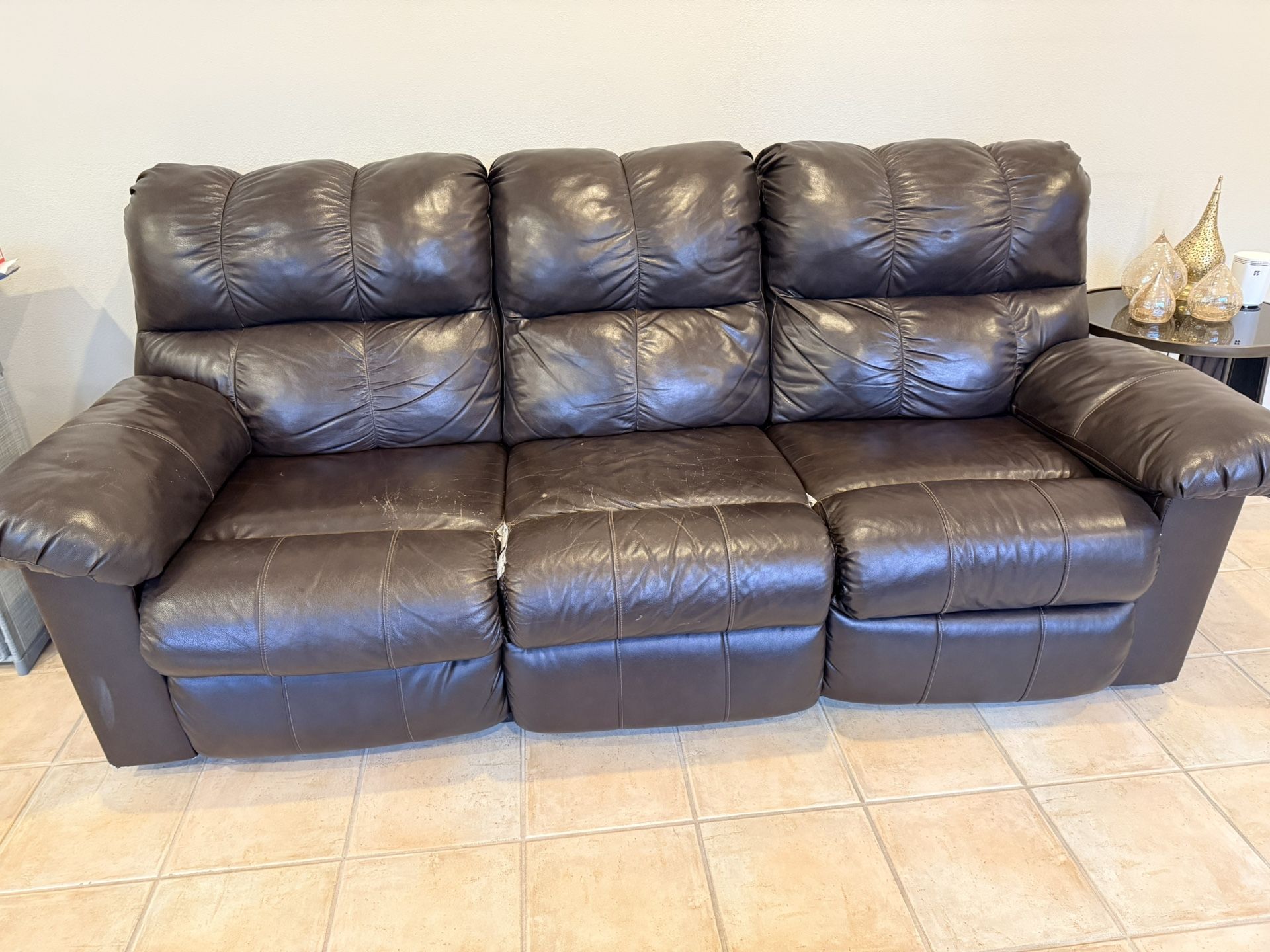 Double reclining brown pure leather couch and loveseat with center console including two cupholders and a compartment under the armrest. Couch : 83” x 31” x 38” Loveseat : 72”x 31” x 38” Bought at Ashley’s. Comes with 4 pillows and a coffee table. Smoke free, pet free home.