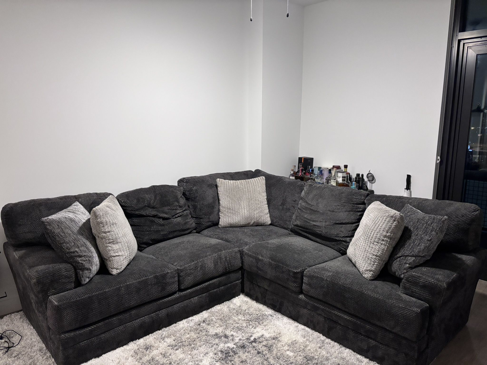 Dark grey cloth sectional. 101 inches (W) by 101 inches (W) 32inches (height) Must come pick up