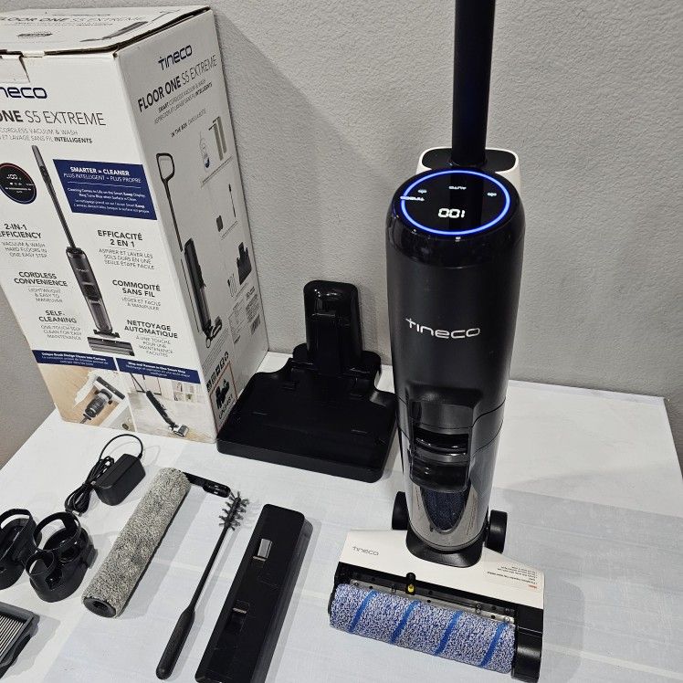 tineco s5 floor one extreme floor washer and vacuum. selling for $200 set. comes with 2 rollers, spare filter, charging base. has 3 modes: auto mode, max mode, and suction only mode. works great, cleaned ready to use