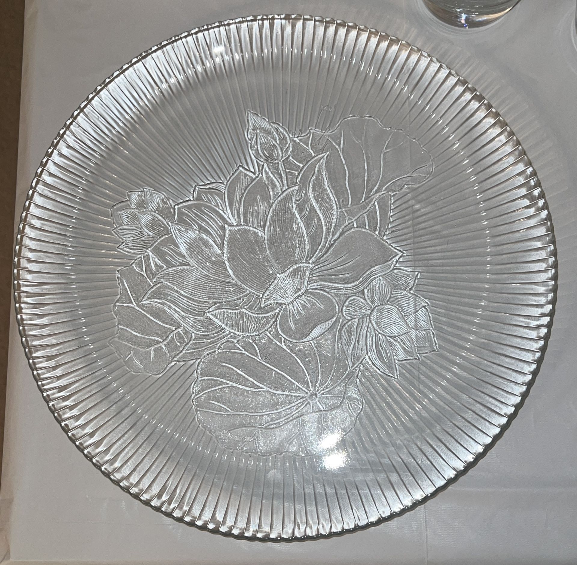 • The plate features a floral design in the center with a scalloped, swirled edge. • The Canterbury pattern was produced by Arcoroc from 1991 to 2021 and is now discontinued. • It is made of tempered glass and not recommended for microwave use. - Torte Plate: 12 1/2 in. - Small Plate Width: 5 3/4 in.