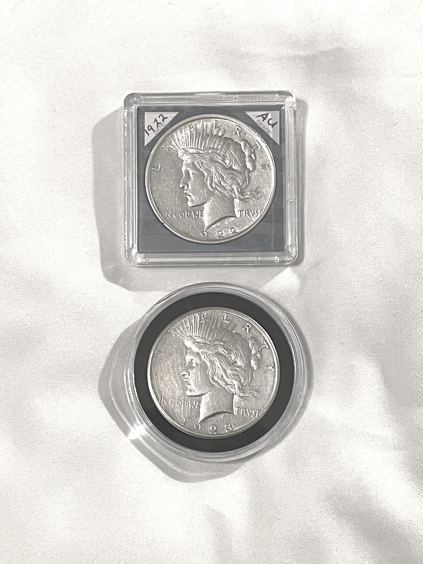 About Uncirculated-AU(50) Sealed In Capsules 1922 And 1923 Piece Silver Dollars. Valued $103 Each On Us Coin Book.