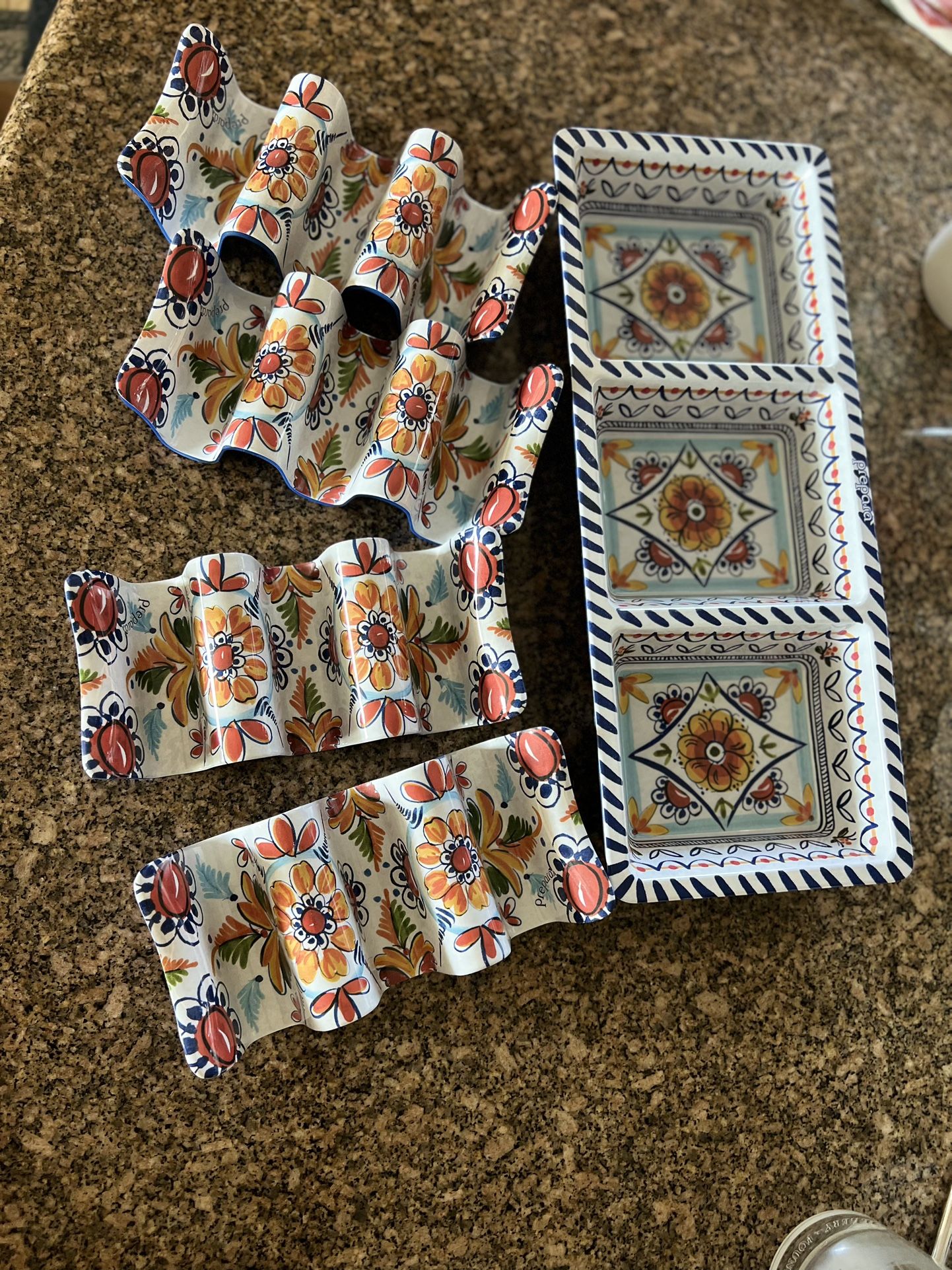 Total 5 pieces left, 4 taco holders, 1 multi section tray. Never used. Brand new, still in box, see images.