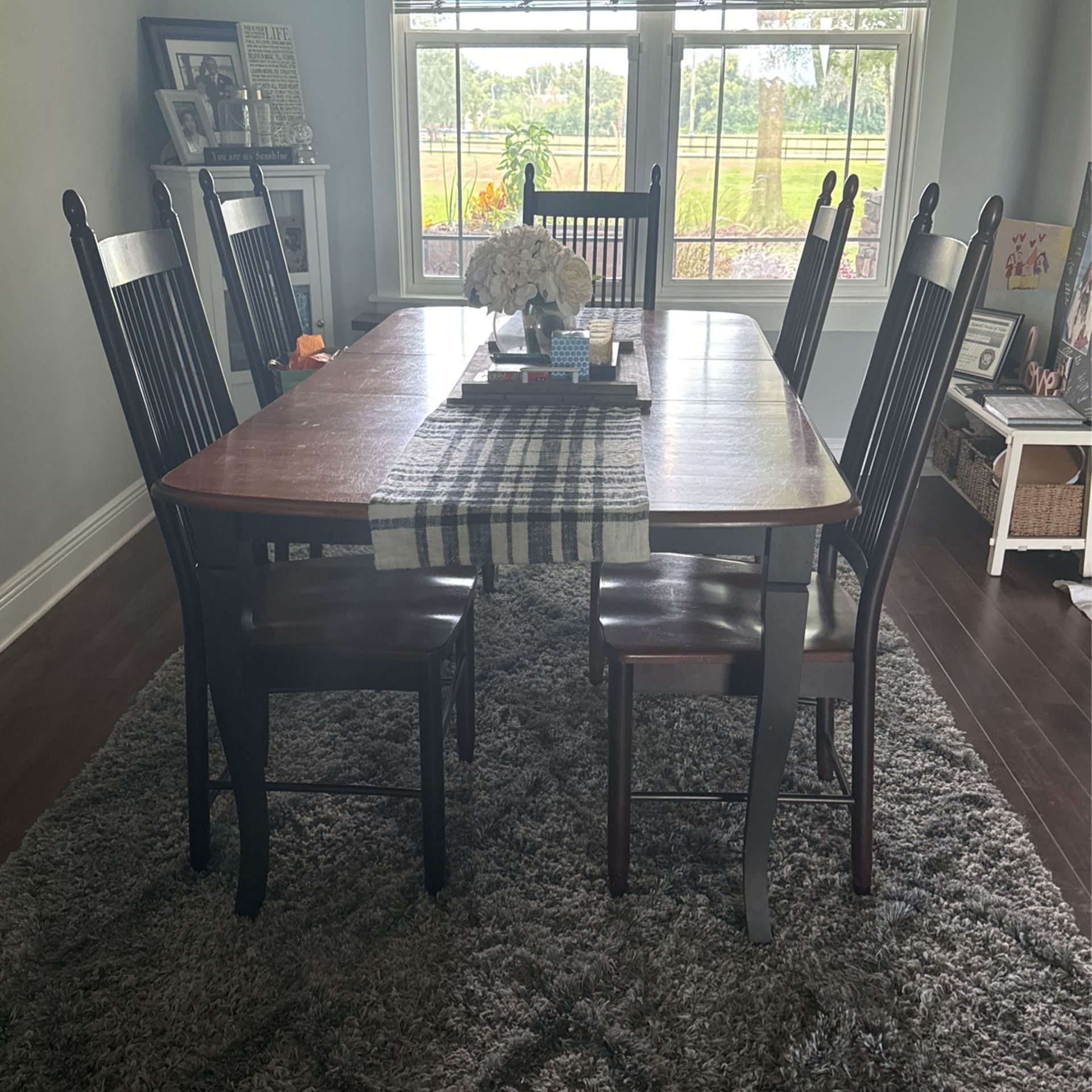 Cherry wood dining set. Set comes with 5 chairs and leaf to expand the table length. This was purchased at Macy’s and it is in pristine condition. This set goes with any theme country, french, farm house. Only reason why I am selling this set is because I am going with a live oak table. Will sell as a set only. Must be able to pick up. Serious buyer no low balling please. Price is negotiable. Check out my other items listed. Measurements without leaf: 60L x 40W x 30H Measurements with leaf: 78L x 40 W x 30 H