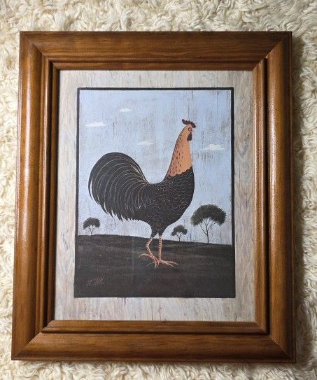 This is a charming, vintage-style art features a signature style that blends rustic warmth with traditional Americana. The print features a black and brown rooster standing in a field under a light blue sky with wispy clouds, framed in a complementary, solid wood frame (actual outer dimensions are approximately 11" x 13"). This piece adds a touch of country charm to any kitchen, living room, or farmhouse decor. Condition: Excellent $5 #20-26
