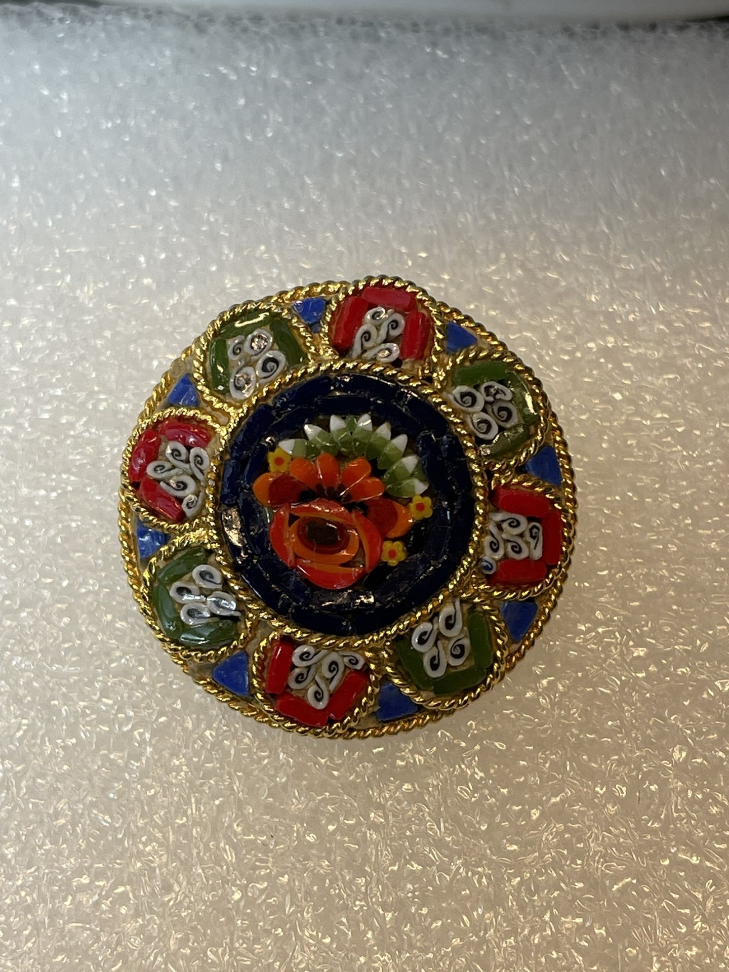 You are looking at a stunning design and exquisite floral micro mosaic circle shaped Italy brooch. Every small details and quality workmanship make this amazing piece a great piece to add in any jewelry collection. It uses a safety pin head clasp. In excellent condition. 1.25” diameter x 8.40mm thick Please inspect each pic for those are important part of item description. Thank you for stopping by.