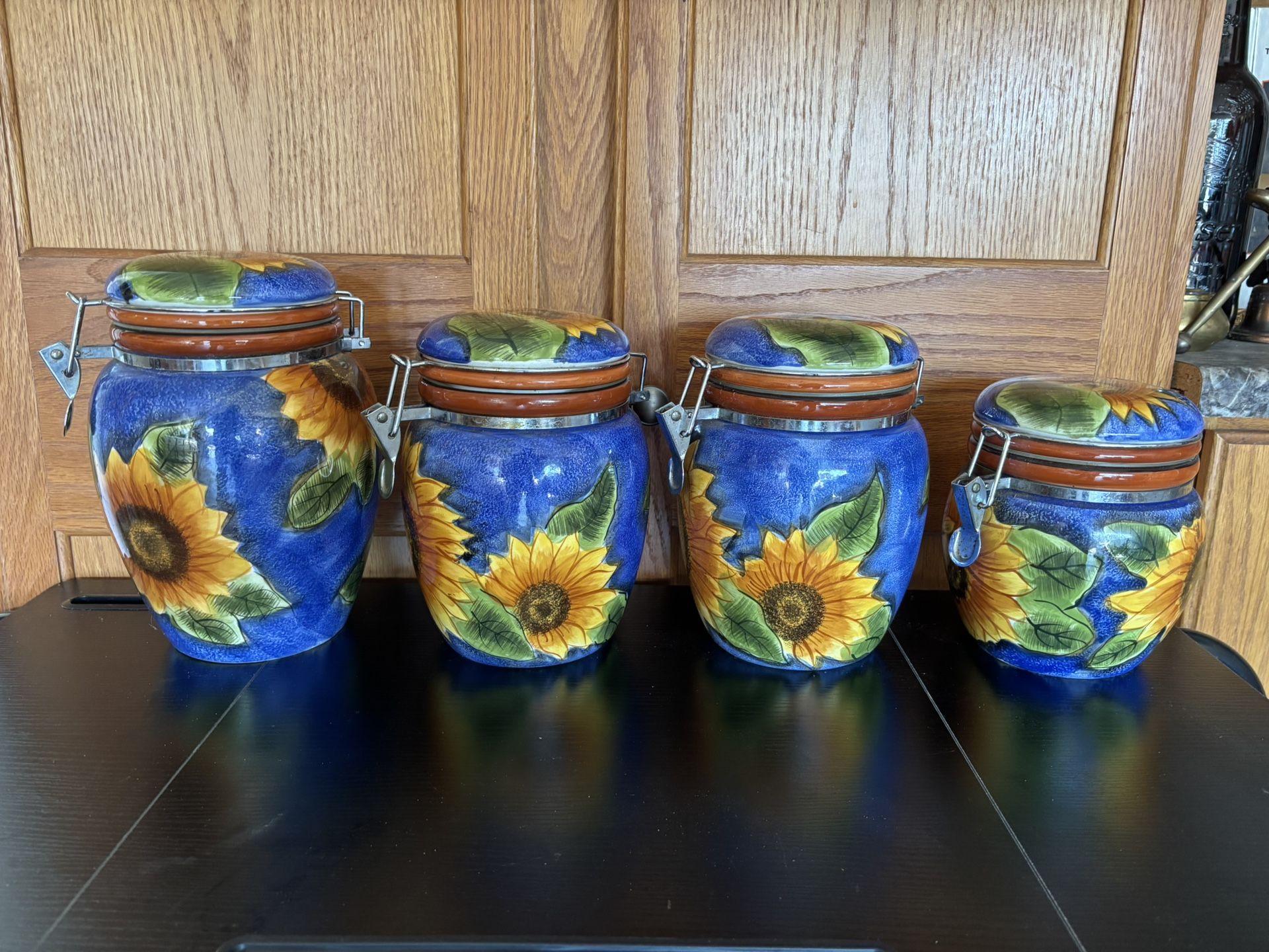 Set of 4 Home ceramic canisters. Large is 9 3/4" and the small is 7"