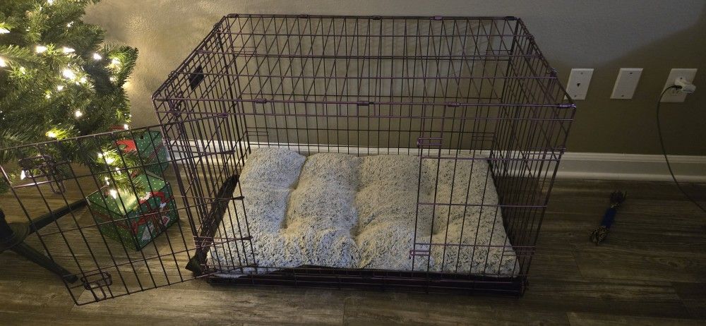 Customized color (purple/black) 36 inch dog crate used by my pugs. Dont need it anymore, still in good condition. Doesnt have a tray but i bought a waterproof mat pad for it. Comes with the bed. Smoke free family.