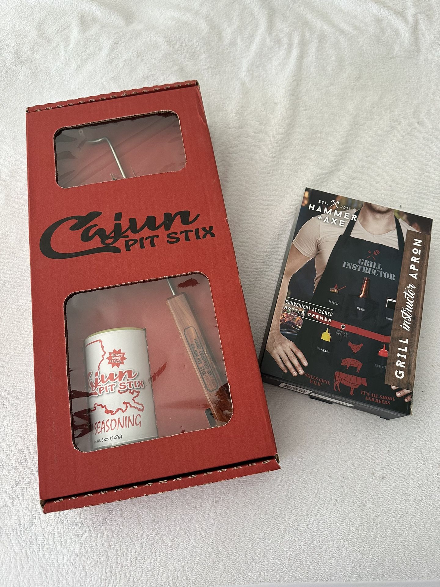 Both items are brand new and perfect to use as a gift for someone. Comes with: - Cajun Pit Stick for grill - Cajun Pit Stick Seasoning - Grilling Apron with multiple pockets