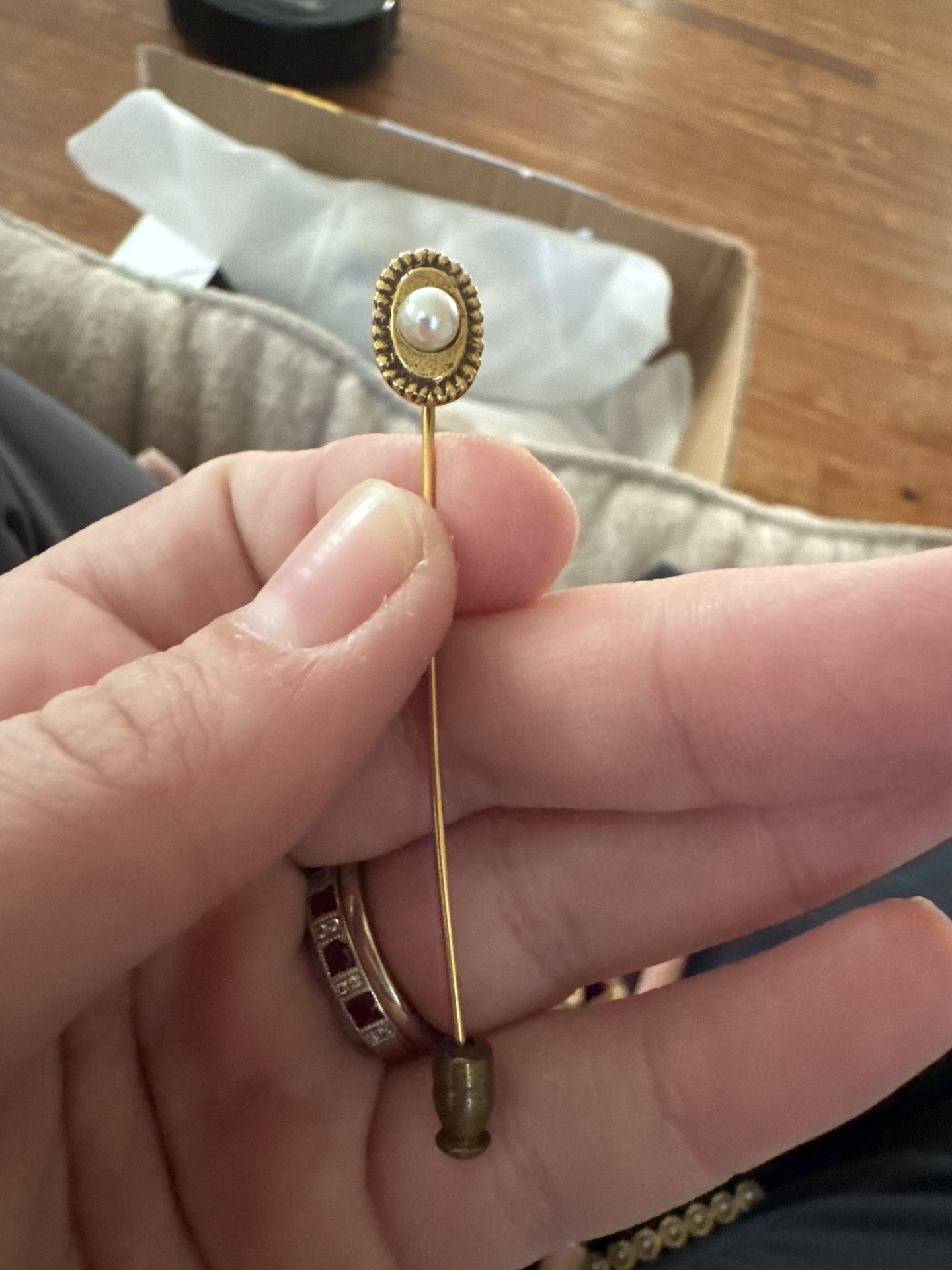 Antique gold toned pearl hat pin