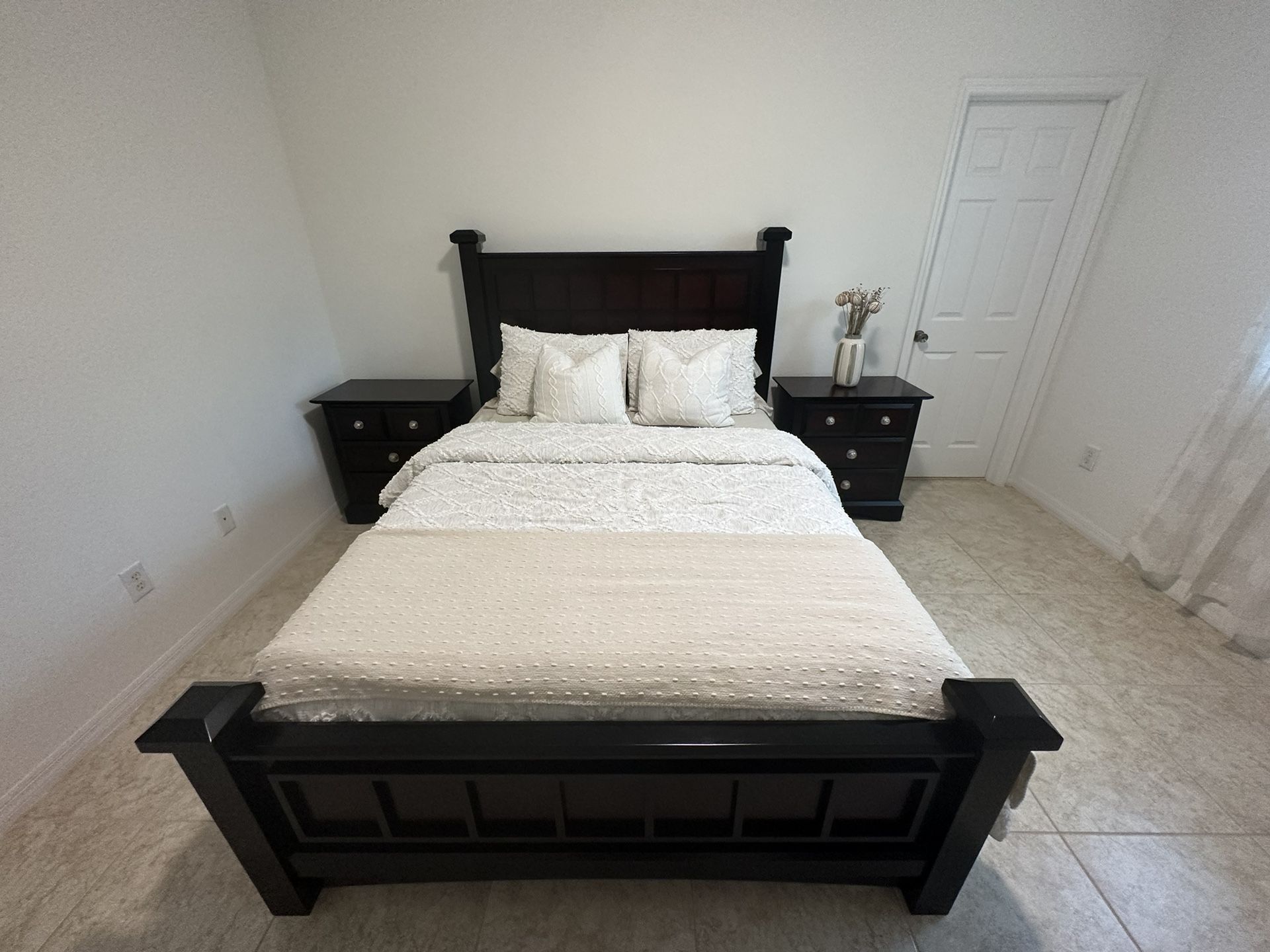Never used bedroom set, tempurpedic mattress never used. Great condition. Nightstand dimensions: 16L 28W 29H bed frame: 89L 66W, footboard height: 28 Headboard height: 59 Queen size mattress