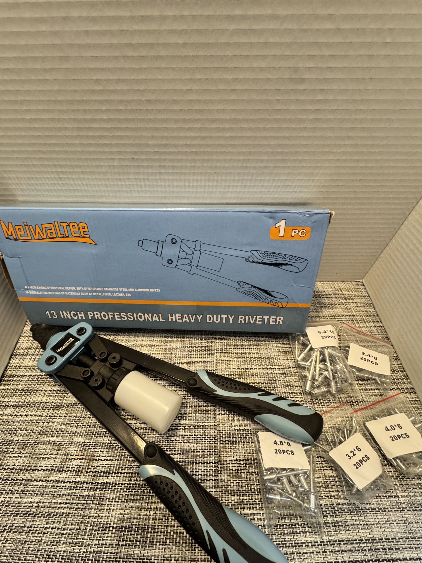 For sale is a MeiWalTee 13-inch Professional Heavy Duty Riveter, perfect for metal fabrication, automotive work, home projects, repairs, and DIY builds. This is a complete rivet gun kit that includes: • ✅ 13” Heavy Duty Rivet Gun • ✅ Soft ergonomic grip handles • ✅ Multiple rivet sizes included: • 2.4mm (3/32”) – 20 pcs • 3.2mm (1/8”) – 20 pcs • 4.0mm (5/32”) – 20 pcs • 4.8mm (3/16”) – 20 pcs • ✅ Original box included ⸻ 🔩 FEATURES: • Heavy-duty steel construction • Long 13” handles for extra leverage • Comfortable non-slip grips • Works with aluminum, steel, leather, plastic & more • Great for automotive, sheet metal, trailers, HVAC, appliances, and crafts ⸻ 💪 PERFECT FOR: • Mechanics & body shops • DIY home repairs • Trailer & metal projects • Tool collectors • Anyone needing a strong, reliable rivet gun